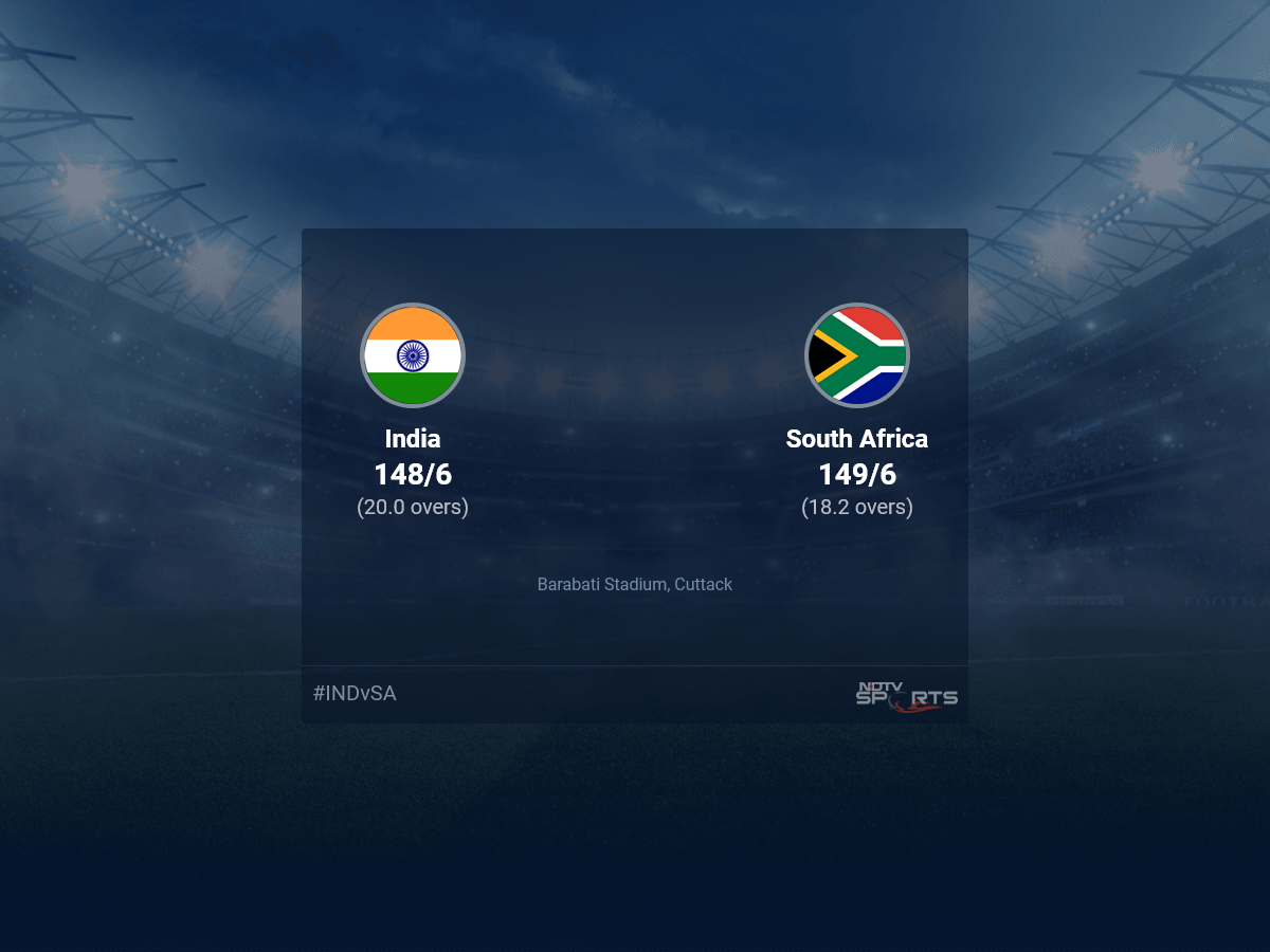 Follow the India vs South Africa 2022 live cricket score on Sports.NDTV.com. After 18.2 overs, South Africa, chasing a target of 149, are 149/6. Get live score, ball by ball commentary and much more. Keep track of India vs South Africa 2022 today match between India and South Africa. Everything related to India and South Africa match will be available on Sports.NDTV.com. Stay updated with India vs South Africa live score. Do check for India vs South Africa scorecard. You can get scorecard updates, match related facts. Get quick live updates with ads, Sports.NDTV.com, which is the perfect destination for live cricket score.