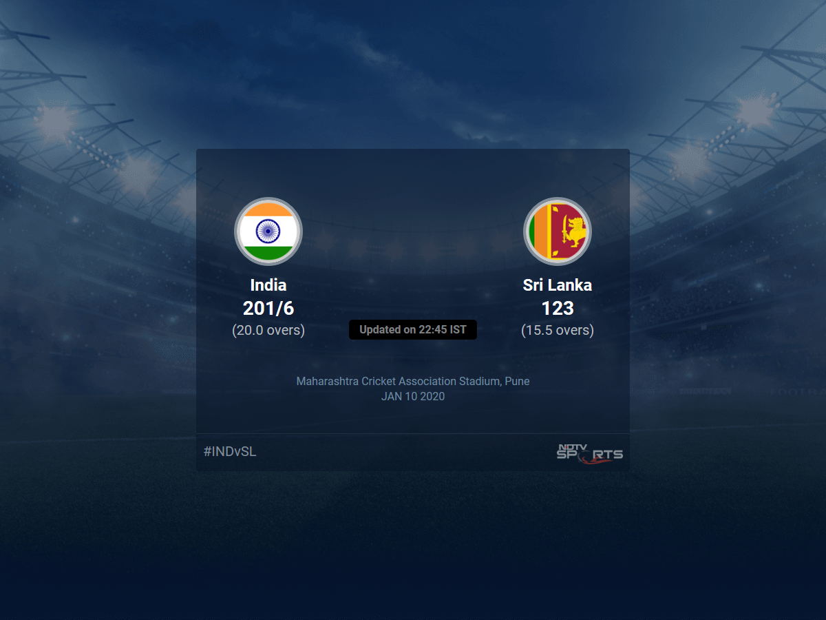 A dedicated team of experts bring you live score, live cricket score, live match update on Sports.NDTV.com. After 15.5 overs, Sri Lanka, chasing a target of 202, are 123. The live updates of India vs Sri Lanka scorecard is also available. It is the perfect platform to follow your favourite teams in India vs Sri Lanka, 2019/20. Keep a track on your favourite batsmen and bowlers through India vs Sri Lanka, 2019/20 today match, ball by ball commentary, India vs Sri Lanka, India vs Sri Lanka live score, India vs Sri Lanka scorecard. Follow the excitement of the India vs Sri Lanka, 2019/20 on Sports.NDTV.com as you can follow live match updates and live cricket score through our platform.