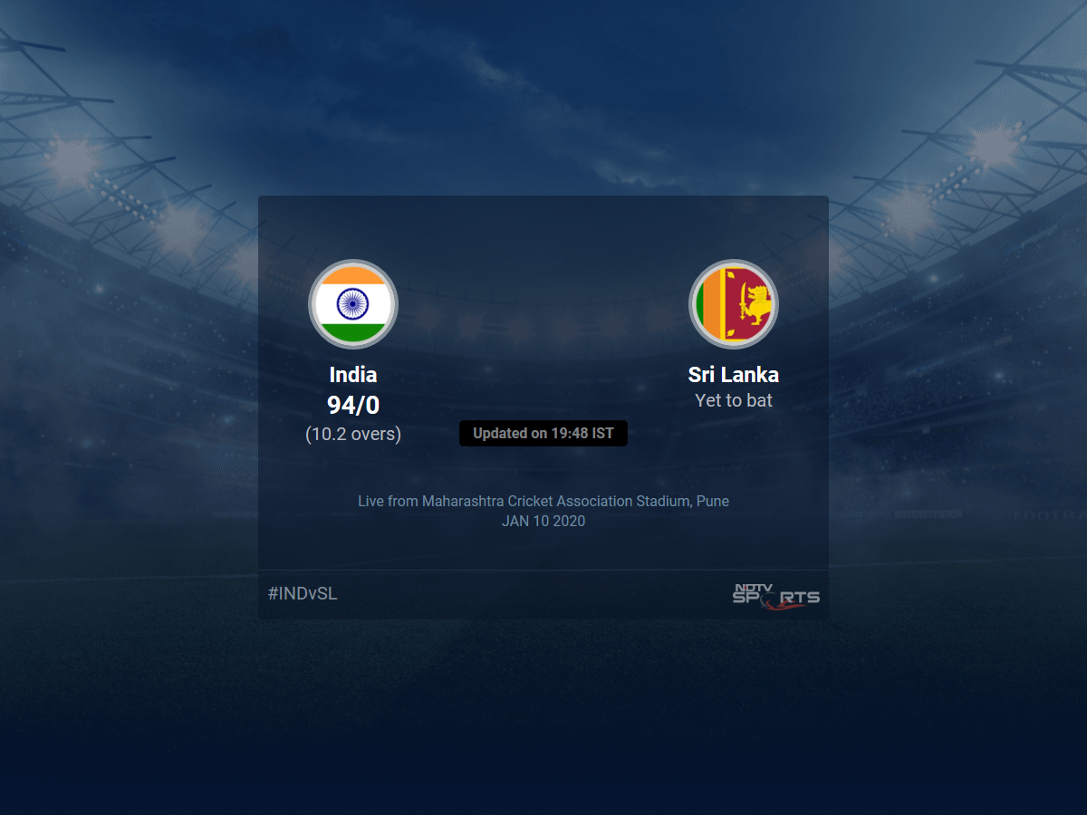 A dedicated team of experts bring you live score, live cricket score, live match update on Sports.NDTV.com. After 10.2 overs, India are 94/0. The live updates of India vs Sri Lanka scorecard is also available. It is the perfect platform to follow your favourite teams in India vs Sri Lanka, 2019/20. Keep a track on your favourite batsmen and bowlers through India vs Sri Lanka, 2019/20 today match, ball by ball commentary, India vs Sri Lanka, India vs Sri Lanka live score, India vs Sri Lanka scorecard. Follow the excitement of the India vs Sri Lanka, 2019/20 on Sports.NDTV.com as you can follow live match updates and live cricket score through our platform.