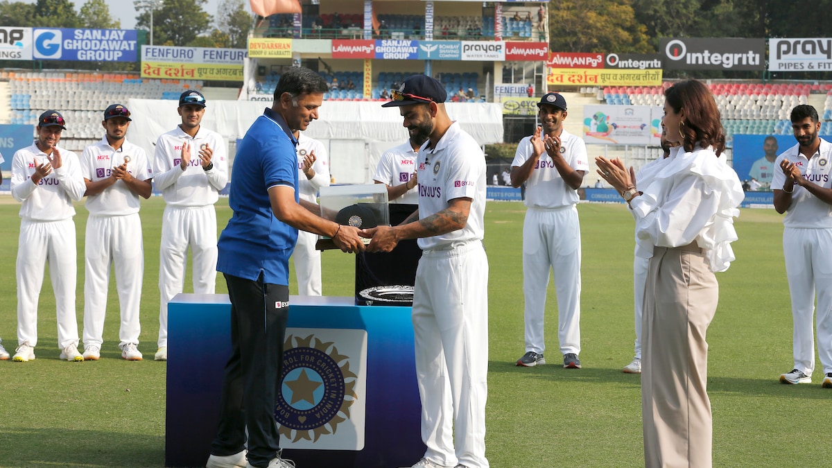 Former India captain and current head coach Rahul Dravid delivered a fantastic speech before presenting a special cap to Virat Kohli on his 100th Test match on Friday. Kohli became only the 12th Indian player to reach the milestone. He reached the landmark in the first Test against Sri Lanka. Kohli was felicitated by Dravid in the presence of the entire Indian side ahead of the start of the Test match. Kohli's wife Anushka Sharma was also present in the ceremony. Dravid said Kohli has been a "testament to everything that is great" in the game of cricket.