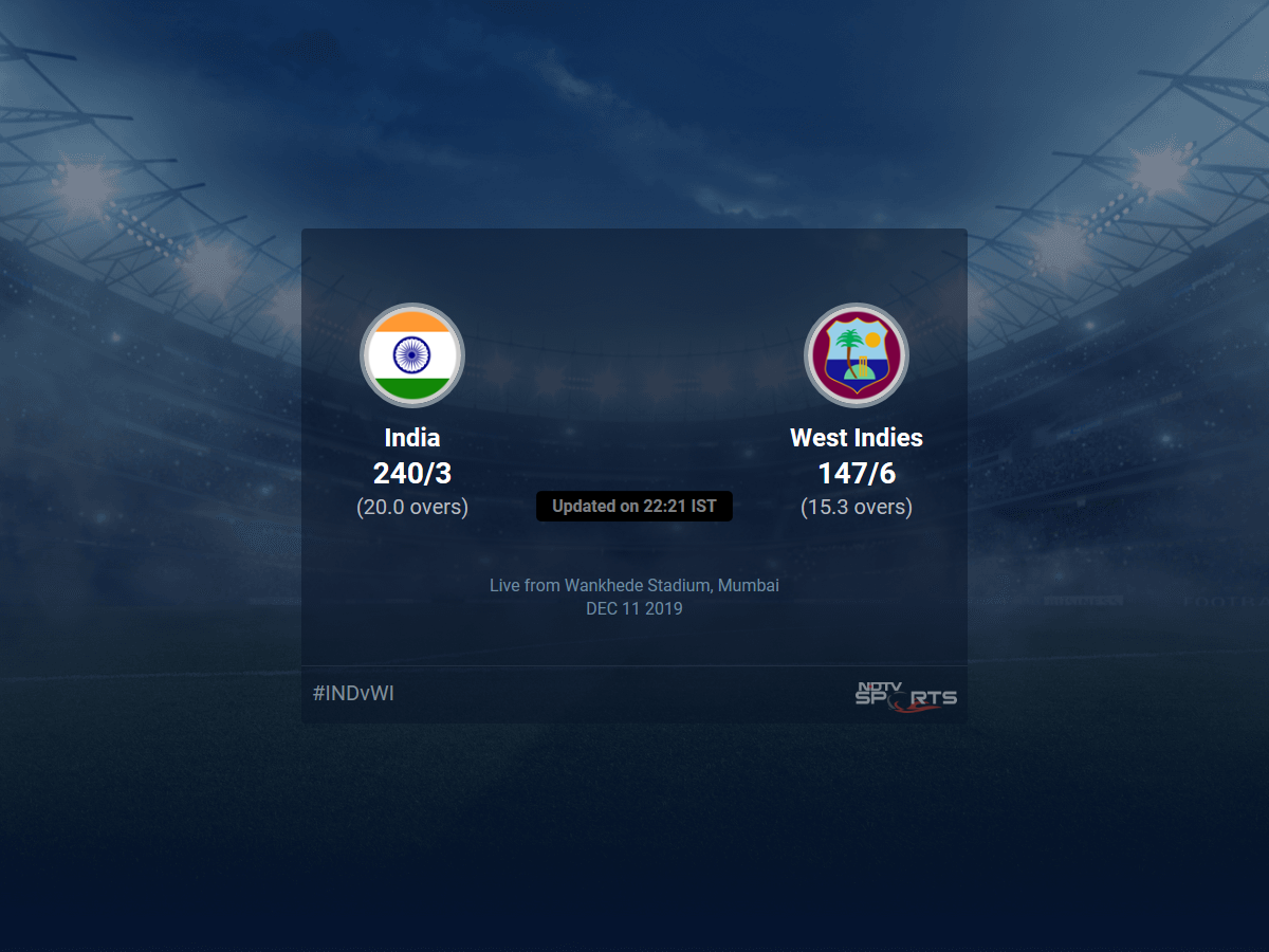 A dedicated team of experts bring you live score, live cricket score, live match update on Sports.NDTV.com. After 15.3 overs, West Indies, chasing a target of 241, are 147/6. The live updates of India vs West Indies scorecard is also available. It is the perfect platform to follow your favourite teams in India vs West Indies 2019/20. Keep a track on your favourite batsmen and bowlers through India vs West Indies 2019/20 today match, ball by ball commentary, India vs West Indies, India vs West Indies live score, India vs West Indies scorecard. Follow the excitement of the India vs West Indies 2019/20 on Sports.NDTV.com as you can follow live match updates and live cricket score through our platform.