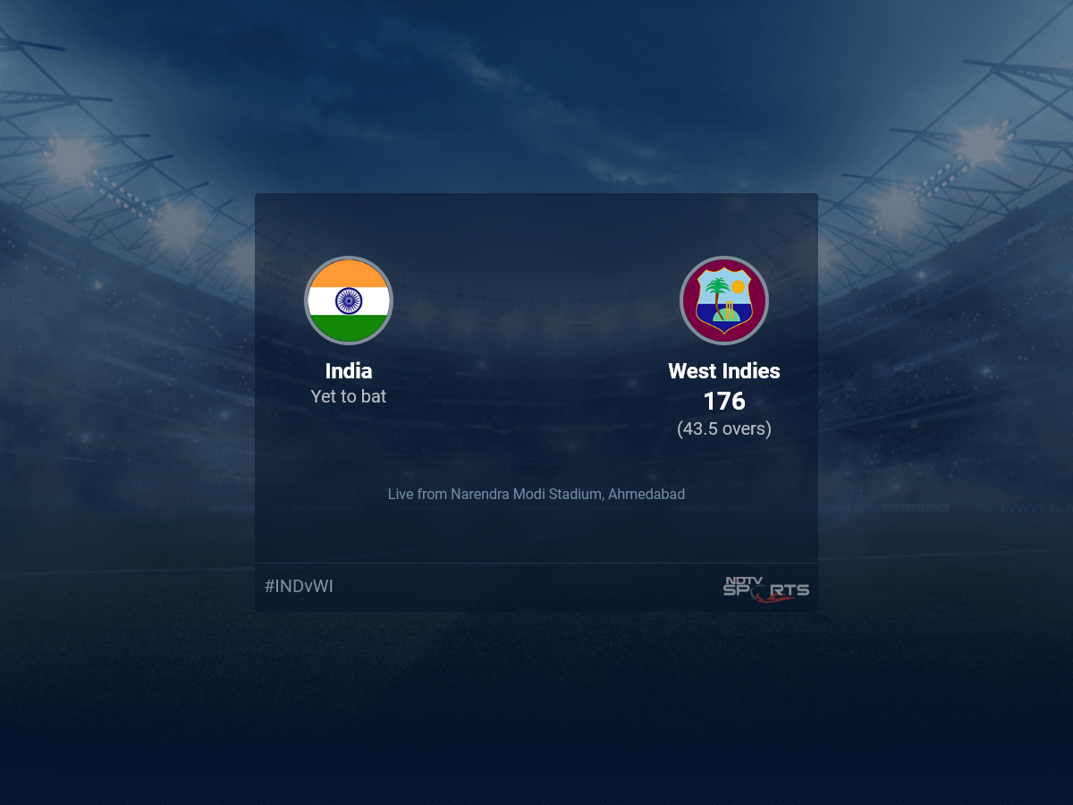 A dedicated team of experts bring you live score, live cricket score, live match update on Sports.NDTV.com. After 43.5 overs, West Indies are 176. The live updates of India vs West Indies scorecard is also available. It is the perfect platform to follow your favourite teams in India vs West Indies 2022. Keep a track on your favourite batsmen and bowlers through India vs West Indies 2022 today match, ball by ball commentary, India vs West Indies, India vs West Indies live score, India vs West Indies scorecard. Follow the excitement of the India vs West Indies 2022 on Sports.NDTV.com as you can follow live match updates and live cricket score through our platform.