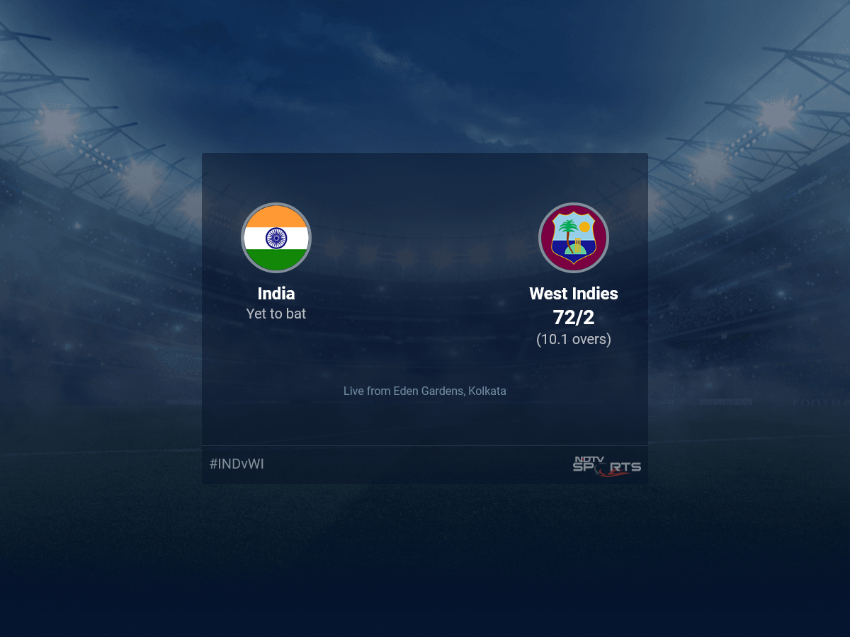 A dedicated team of experts bring you live score, live cricket score, live match update on Sports.NDTV.com. After 10.1 overs, West Indies are 72/2. The live updates of India vs West Indies scorecard is also available. It is the perfect platform to follow your favourite teams in India vs West Indies 2022. Keep a track on your favourite batsmen and bowlers through India vs West Indies 2022 today match, ball by ball commentary, India vs West Indies, India vs West Indies live score, India vs West Indies scorecard. Follow the excitement of the India vs West Indies 2022 on Sports.NDTV.com as you can follow live match updates and live cricket score through our platform.