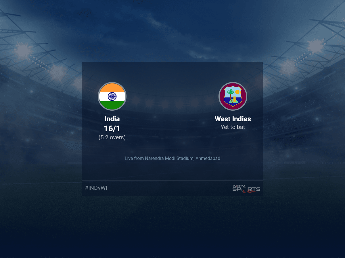 Follow the India vs West Indies 2022 live cricket score on Sports.NDTV.com. After 5.2 overs, India are 16/1. Get live score, ball by ball commentary and much more. Keep track of India vs West Indies 2022 today match between India and West Indies. Everything related to India and West Indies match will be available on Sports.NDTV.com. Stay updated with India vs West Indies live score. Do check for India vs West Indies scorecard. You can get scorecard updates, match related facts. Get quick live updates with ads, Sports.NDTV.com, which is the perfect destination for live cricket score.