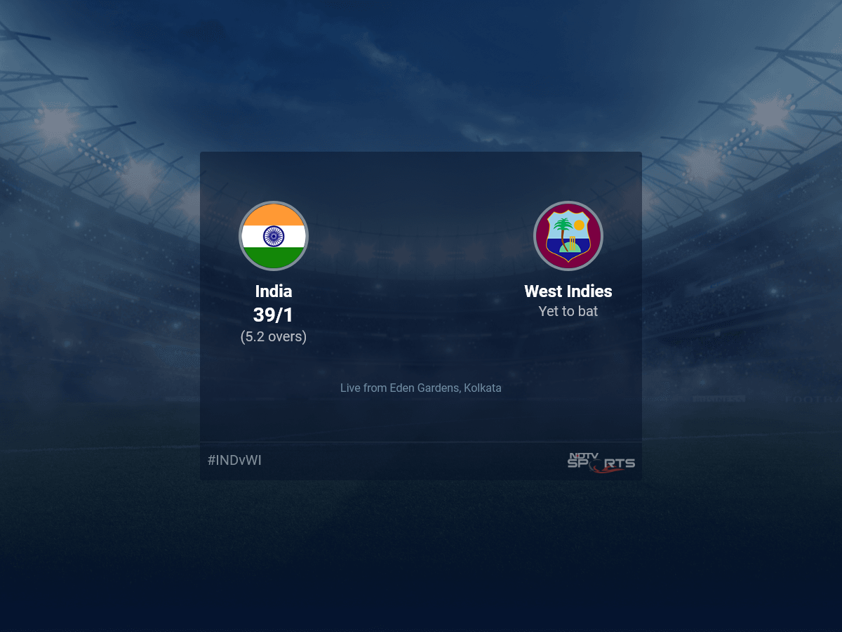 A dedicated team of experts bring you live score, live cricket score, live match update on Sports.NDTV.com. After 5.2 overs, India are 39/1. The live updates of India vs West Indies scorecard is also available. It is the perfect platform to follow your favourite teams in India vs West Indies 2022. Keep a track on your favourite batsmen and bowlers through India vs West Indies 2022 today match, ball by ball commentary, India vs West Indies, India vs West Indies live score, India vs West Indies scorecard. Follow the excitement of the India vs West Indies 2022 on Sports.NDTV.com as you can follow live match updates and live cricket score through our platform.