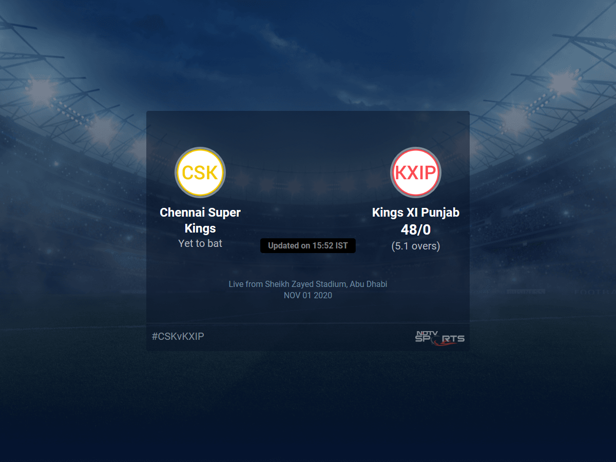 A dedicated team of experts bring you live score, live cricket score, live match update on Sports.NDTV.com. After 5.1 overs, Kings XI Punjab are 48/0. The live updates of Chennai Super Kings vs Kings XI Punjab scorecard is also available. It is the perfect platform to follow your favourite teams in Indian Premier League 2020. Keep a track on your favourite batsmen and bowlers through Indian Premier League 2020 today match, ball by ball commentary, Chennai Super Kings vs Kings XI Punjab, Chennai Super Kings vs Kings XI Punjab live score, Chennai Super Kings vs Kings XI Punjab scorecard. Follow the excitement of the Indian Premier League 2020 on Sports.NDTV.com as you can follow live match updates and live cricket score through our platform.