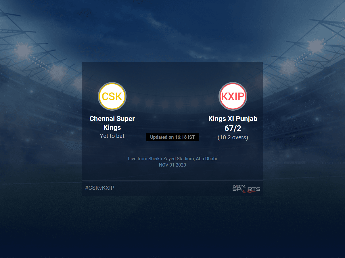 A dedicated team of experts bring you live score, live cricket score, live match update on Sports.NDTV.com. After 10.2 overs, Kings XI Punjab are 67/2. The live updates of Chennai Super Kings vs Kings XI Punjab scorecard is also available. It is the perfect platform to follow your favourite teams in Indian Premier League 2020. Keep a track on your favourite batsmen and bowlers through Indian Premier League 2020 today match, ball by ball commentary, Chennai Super Kings vs Kings XI Punjab, Chennai Super Kings vs Kings XI Punjab live score, Chennai Super Kings vs Kings XI Punjab scorecard. Follow the excitement of the Indian Premier League 2020 on Sports.NDTV.com as you can follow live match updates and live cricket score through our platform.