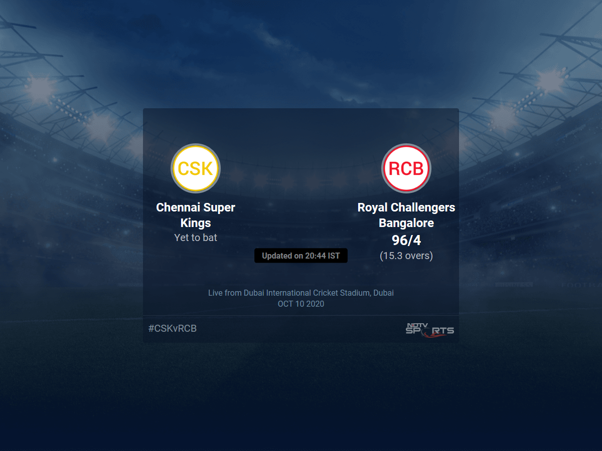 A dedicated team of experts bring you live score, live cricket score, live match update on Sports.NDTV.com. After 15.3 overs, Royal Challengers Bangalore are 96/4. The live updates of Chennai Super Kings vs Royal Challengers Bangalore scorecard is also available. It is the perfect platform to follow your favourite teams in Indian Premier League 2020. Keep a track on your favourite batsmen and bowlers through Indian Premier League 2020 today match, ball by ball commentary, Chennai Super Kings vs Royal Challengers Bangalore, Chennai Super Kings vs Royal Challengers Bangalore live score, Chennai Super Kings vs Royal Challengers Bangalore scorecard. Follow the excitement of the Indian Premier League 2020 on Sports.NDTV.com as you can follow live match updates and live cricket score through our platform.