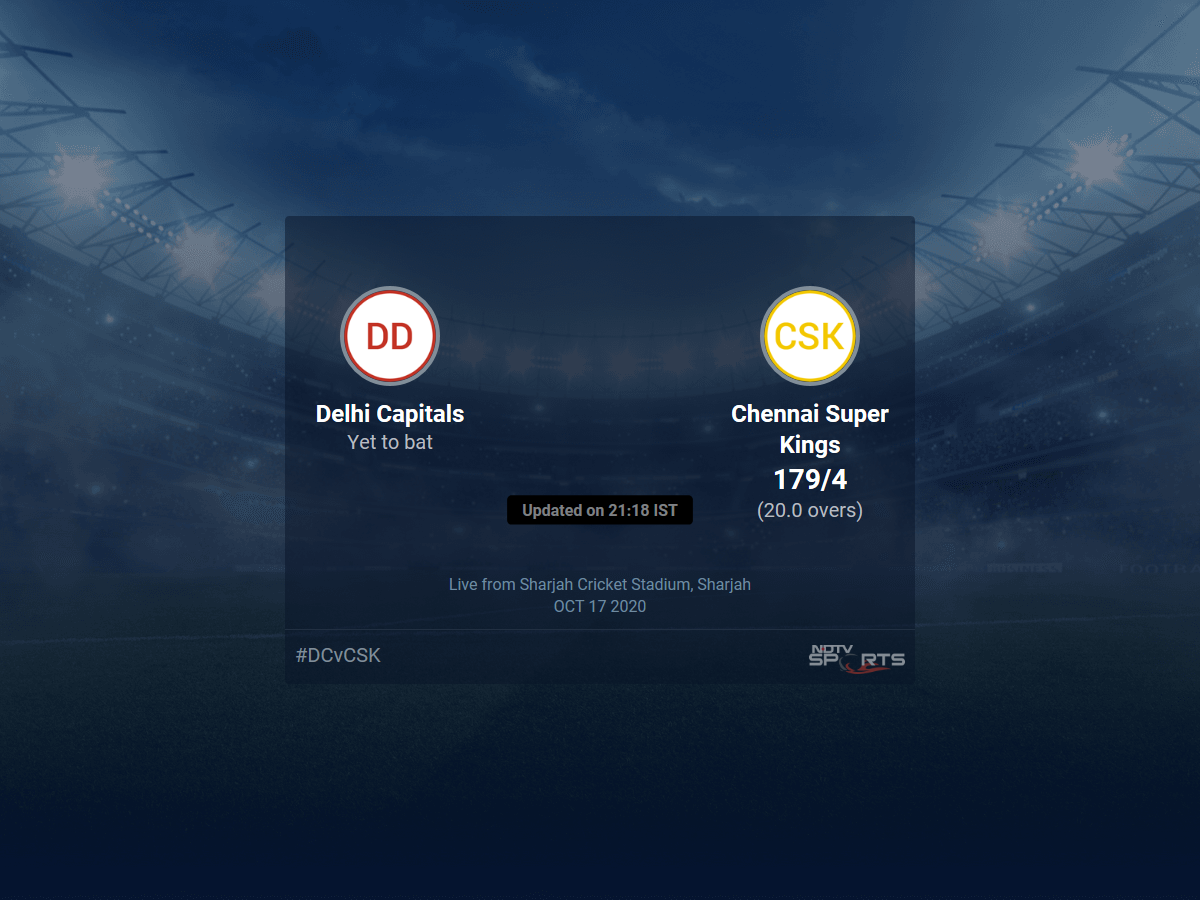 Follow the Indian Premier League 2020 live cricket score on Sports.NDTV.com. After 20.0 overs, Chennai Super Kings are 179/4. Get live score, ball by ball commentary and much more. Keep track of Indian Premier League 2020 today match between Delhi Capitals and Chennai Super Kings. Everything related to Delhi Capitals and Chennai Super Kings match will be available on Sports.NDTV.com. Stay updated with Delhi Capitals vs Chennai Super Kings live score. Do check for Delhi Capitals vs Chennai Super Kings scorecard. You can get scorecard updates, match related facts. Get quick live updates with ads, Sports.NDTV.com, which is the perfect destination for live cricket score.