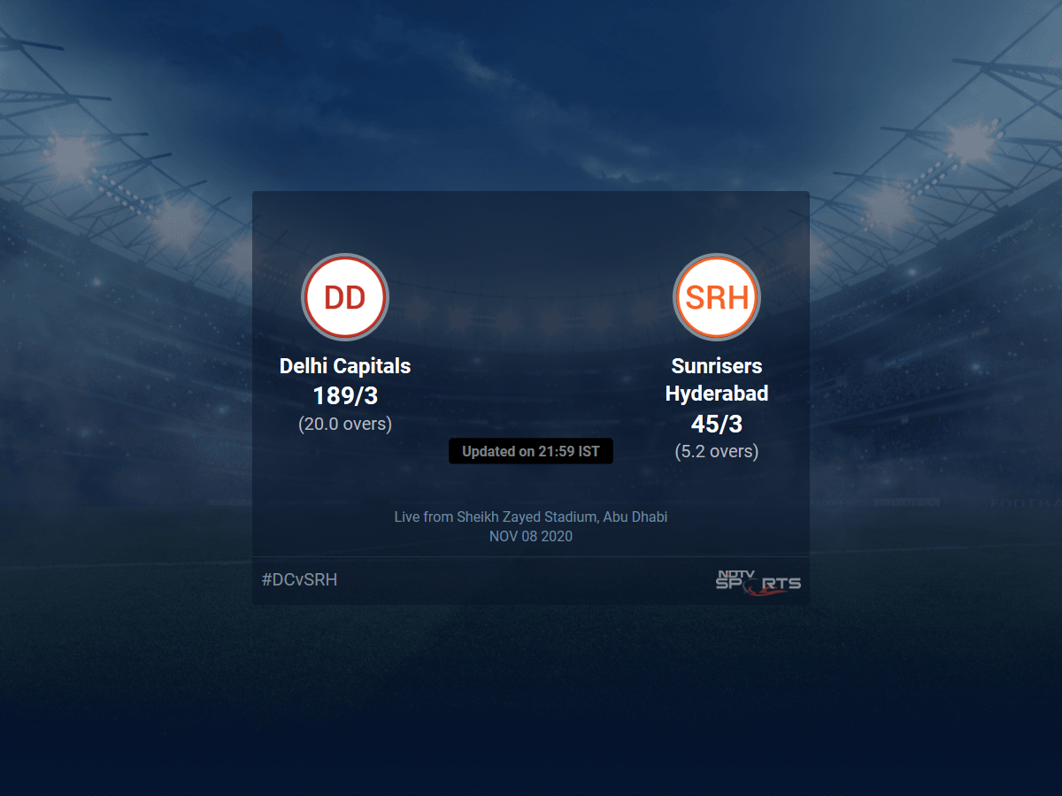 Follow the Indian Premier League 2020 live cricket score on Sports.NDTV.com. After 5.2 overs, Sunrisers Hyderabad, chasing a target of 190, are 45/3. Get live score, ball by ball commentary and much more. Keep track of Indian Premier League 2020 today match between Delhi Capitals and Sunrisers Hyderabad. Everything related to Delhi Capitals and Sunrisers Hyderabad match will be available on Sports.NDTV.com. Stay updated with Delhi Capitals vs Sunrisers Hyderabad live score. Do check for Delhi Capitals vs Sunrisers Hyderabad scorecard. You can get scorecard updates, match related facts. Get quick live updates with ads, Sports.NDTV.com, which is the perfect destination for live cricket score.