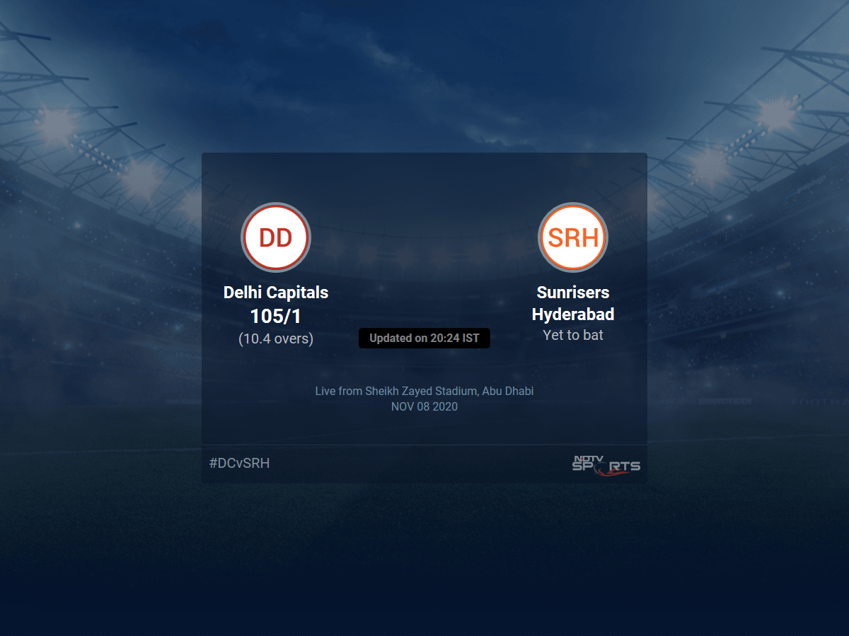 Follow the Indian Premier League 2020 live cricket score on Sports.NDTV.com. After 10.4 overs, Delhi Capitals are 105/1. Get live score, ball by ball commentary and much more. Keep track of Indian Premier League 2020 today match between Delhi Capitals and Sunrisers Hyderabad. Everything related to Delhi Capitals and Sunrisers Hyderabad match will be available on Sports.NDTV.com. Stay updated with Delhi Capitals vs Sunrisers Hyderabad live score. Do check for Delhi Capitals vs Sunrisers Hyderabad scorecard. You can get scorecard updates, match related facts. Get quick live updates with ads, Sports.NDTV.com, which is the perfect destination for live cricket score.