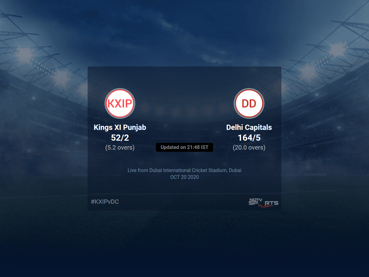 Follow the Indian Premier League 2020 live cricket score on Sports.NDTV.com. After 5.2 overs, Kings XI Punjab, chasing a target of 165, are 52/2. Get live score, ball by ball commentary and much more. Keep track of Indian Premier League 2020 today match between Kings XI Punjab and Delhi Capitals. Everything related to Kings XI Punjab and Delhi Capitals match will be available on Sports.NDTV.com. Stay updated with Kings XI Punjab vs Delhi Capitals live score. Do check for Kings XI Punjab vs Delhi Capitals scorecard. You can get scorecard updates, match related facts. Get quick live updates with ads, Sports.NDTV.com, which is the perfect destination for live cricket score.