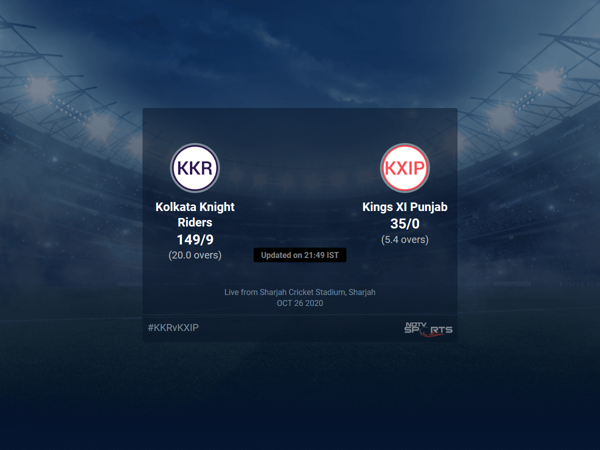 A dedicated team of experts bring you live score, live cricket score, live match update on Sports.NDTV.com. After 5.4 overs, Kings XI Punjab, chasing a target of 150, are 35/0. The live updates of Kolkata Knight Riders vs Kings XI Punjab scorecard is also available. It is the perfect platform to follow your favourite teams in Indian Premier League 2020. Keep a track on your favourite batsmen and bowlers through Indian Premier League 2020 today match, ball by ball commentary, Kolkata Knight Riders vs Kings XI Punjab, Kolkata Knight Riders vs Kings XI Punjab live score, Kolkata Knight Riders vs Kings XI Punjab scorecard. Follow the excitement of the Indian Premier League 2020 on Sports.NDTV.com as you can follow live match updates and live cricket score through our platform.