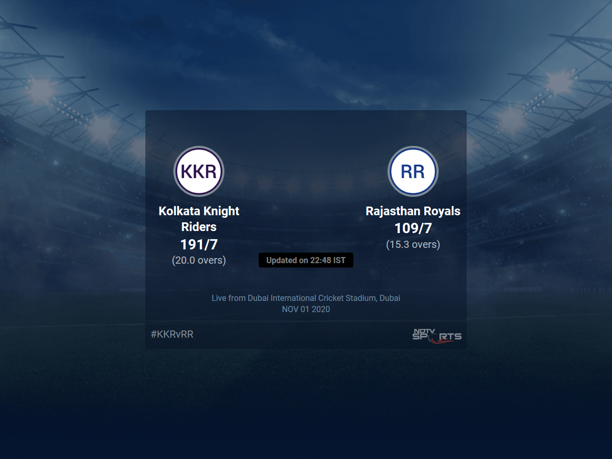 A dedicated team of experts bring you live score, live cricket score, live match update on Sports.NDTV.com. After 15.3 overs, Rajasthan Royals, chasing a target of 192, are 109/7. The live updates of Kolkata Knight Riders vs Rajasthan Royals scorecard is also available. It is the perfect platform to follow your favourite teams in Indian Premier League 2020. Keep a track on your favourite batsmen and bowlers through Indian Premier League 2020 today match, ball by ball commentary, Kolkata Knight Riders vs Rajasthan Royals, Kolkata Knight Riders vs Rajasthan Royals live score, Kolkata Knight Riders vs Rajasthan Royals scorecard. Follow the excitement of the Indian Premier League 2020 on Sports.NDTV.com as you can follow live match updates and live cricket score through our platform.