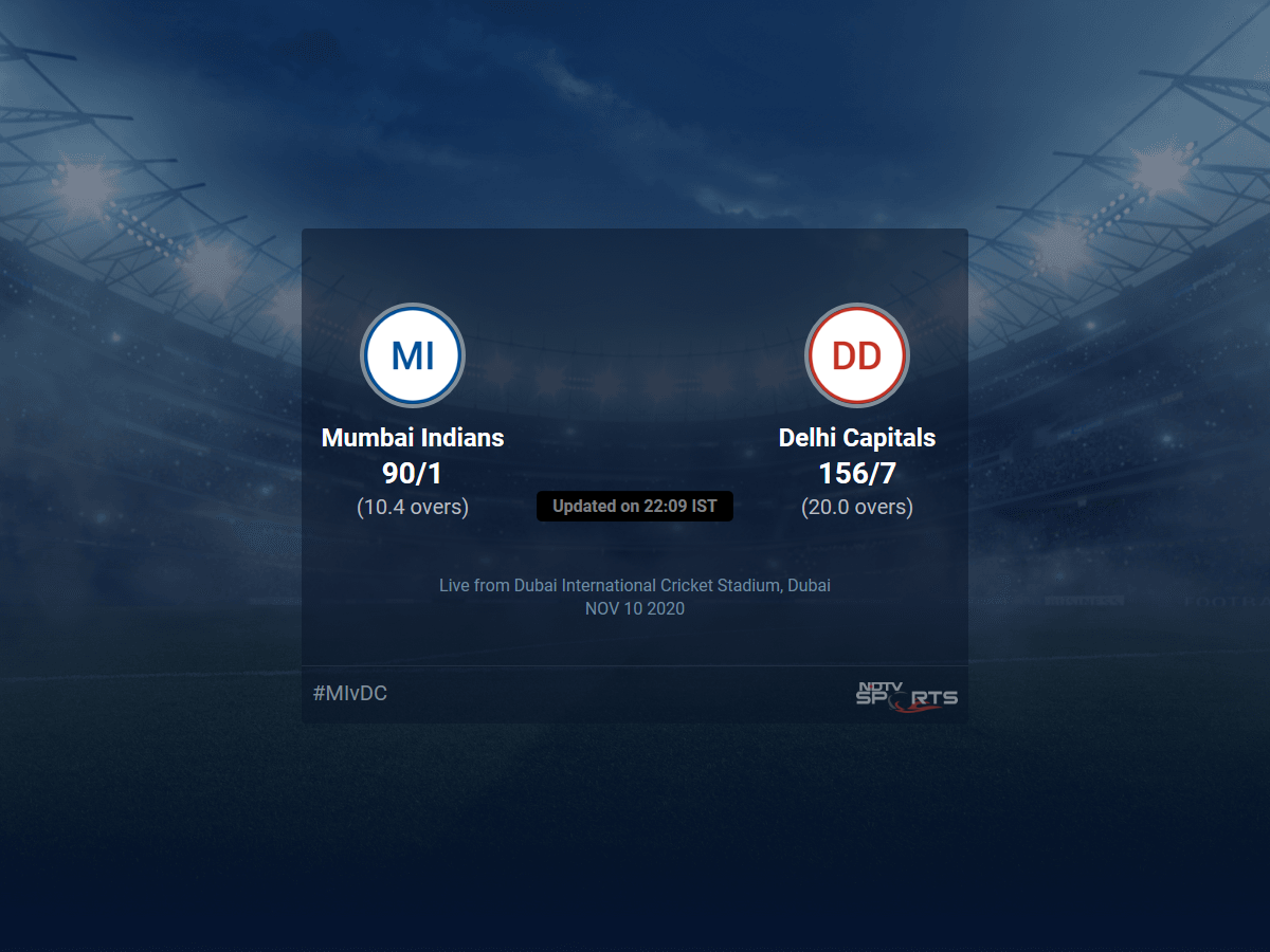 Follow the Indian Premier League 2020 live cricket score on Sports.NDTV.com. After 10.4 overs, Mumbai Indians, chasing a target of 157, are 90/1. Get live score, ball by ball commentary and much more. Keep track of Indian Premier League 2020 today match between Mumbai Indians and Delhi Capitals. Everything related to Mumbai Indians and Delhi Capitals match will be available on Sports.NDTV.com. Stay updated with Mumbai Indians vs Delhi Capitals live score. Do check for Mumbai Indians vs Delhi Capitals scorecard. You can get scorecard updates, match related facts. Get quick live updates with ads, Sports.NDTV.com, which is the perfect destination for live cricket score.
