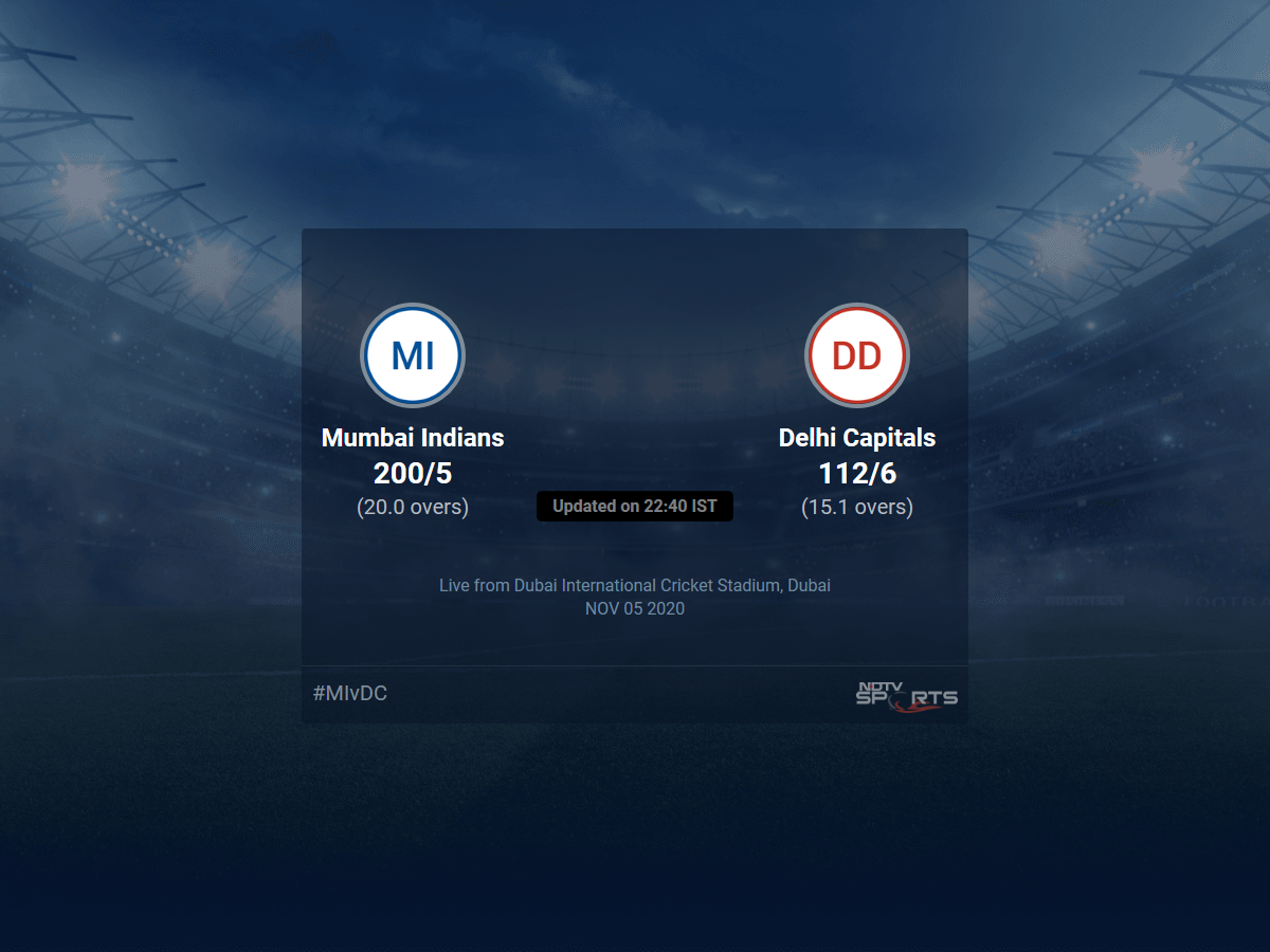 A dedicated team of experts bring you live score, live cricket score, live match update on Sports.NDTV.com. After 15.1 overs, Delhi Capitals, chasing a target of 201, are 112/6. The live updates of Mumbai Indians vs Delhi Capitals scorecard is also available. It is the perfect platform to follow your favourite teams in Indian Premier League 2020. Keep a track on your favourite batsmen and bowlers through Indian Premier League 2020 today match, ball by ball commentary, Mumbai Indians vs Delhi Capitals, Mumbai Indians vs Delhi Capitals live score, Mumbai Indians vs Delhi Capitals scorecard. Follow the excitement of the Indian Premier League 2020 on Sports.NDTV.com as you can follow live match updates and live cricket score through our platform.
