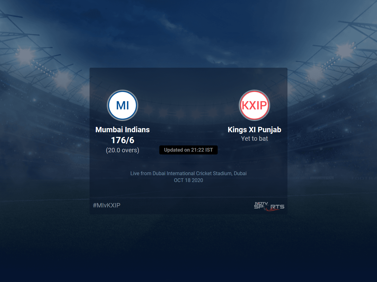 Follow the Indian Premier League 2020 live cricket score on Sports.NDTV.com. After 20.0 overs, Mumbai Indians are 176/6. Get live score, ball by ball commentary and much more. Keep track of Indian Premier League 2020 today match between Mumbai Indians and Kings XI Punjab. Everything related to Mumbai Indians and Kings XI Punjab match will be available on Sports.NDTV.com. Stay updated with Mumbai Indians vs Kings XI Punjab live score. Do check for Mumbai Indians vs Kings XI Punjab scorecard. You can get scorecard updates, match related facts. Get quick live updates with ads, Sports.NDTV.com, which is the perfect destination for live cricket score.