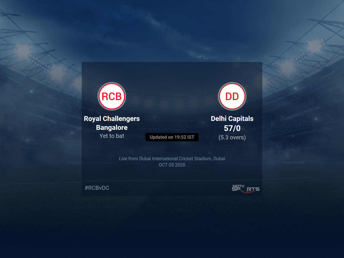 A dedicated team of experts bring you live score, live cricket score, live match update on Sports.NDTV.com. After 5.3 overs, Delhi Capitals are 57/0. The live updates of Royal Challengers Bangalore vs Delhi Capitals scorecard is also available. It is the perfect platform to follow your favourite teams in Indian Premier League 2020. Keep a track on your favourite batsmen and bowlers through Indian Premier League 2020 today match, ball by ball commentary, Royal Challengers Bangalore vs Delhi Capitals, Royal Challengers Bangalore vs Delhi Capitals live score, Royal Challengers Bangalore vs Delhi Capitals scorecard. Follow the excitement of the Indian Premier League 2020 on Sports.NDTV.com as you can follow live match updates and live cricket score through our platform.