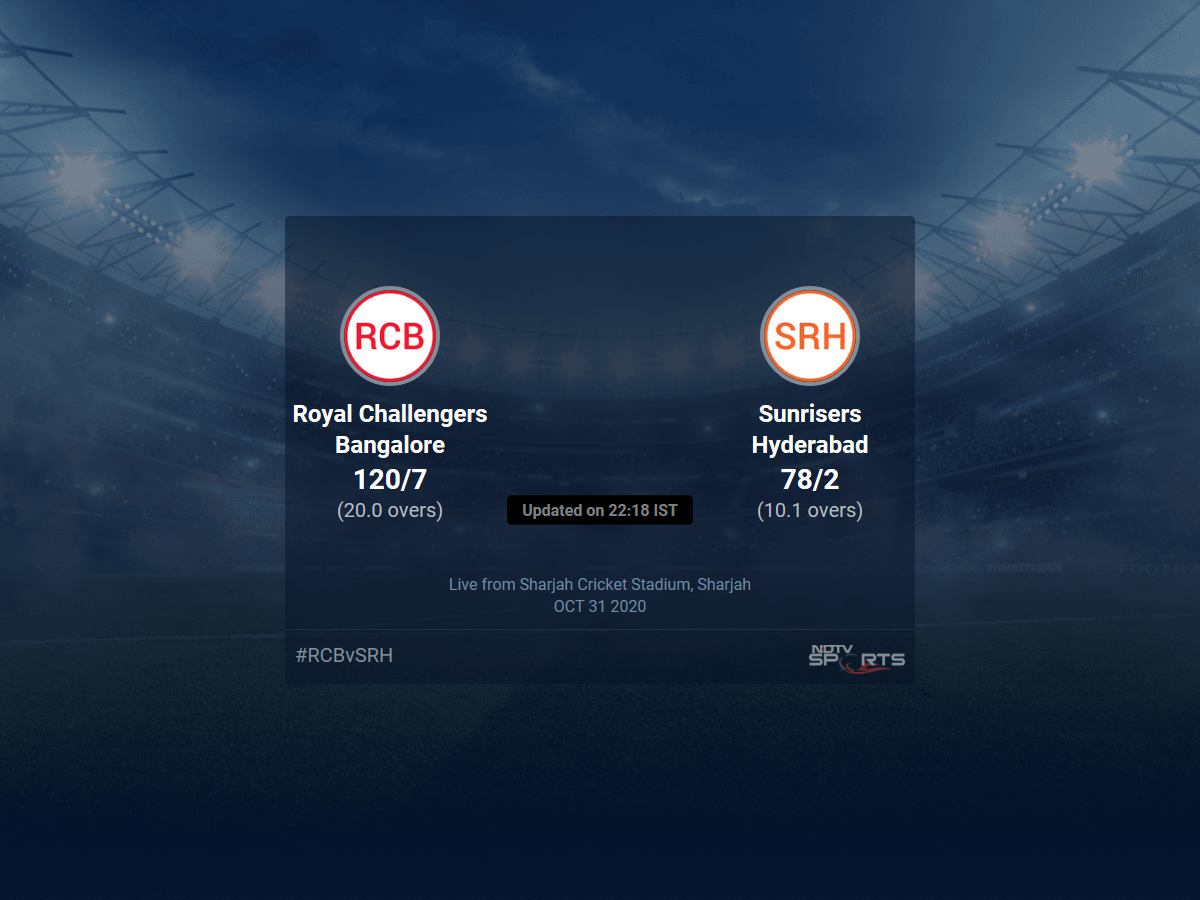 Follow the Indian Premier League 2020 live cricket score on Sports.NDTV.com. After 10.1 overs, Sunrisers Hyderabad, chasing a target of 121, are 78/2. Get live score, ball by ball commentary and much more. Keep track of Indian Premier League 2020 today match between Royal Challengers Bangalore and Sunrisers Hyderabad. Everything related to Royal Challengers Bangalore and Sunrisers Hyderabad match will be available on Sports.NDTV.com. Stay updated with Royal Challengers Bangalore vs Sunrisers Hyderabad live score. Do check for Royal Challengers Bangalore vs Sunrisers Hyderabad scorecard. You can get scorecard updates, match related facts. Get quick live updates with ads, Sports.NDTV.com, which is the perfect destination for live cricket score.