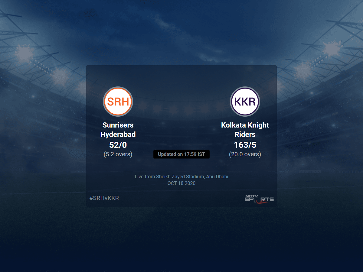 Follow the Indian Premier League 2020 live cricket score on Sports.NDTV.com. After 5.2 overs, Sunrisers Hyderabad, chasing a target of 164, are 52/0. Get live score, ball by ball commentary and much more. Keep track of Indian Premier League 2020 today match between Sunrisers Hyderabad and Kolkata Knight Riders. Everything related to Sunrisers Hyderabad and Kolkata Knight Riders match will be available on Sports.NDTV.com. Stay updated with Sunrisers Hyderabad vs Kolkata Knight Riders live score. Do check for Sunrisers Hyderabad vs Kolkata Knight Riders scorecard. You can get scorecard updates, match related facts. Get quick live updates with ads, Sports.NDTV.com, which is the perfect destination for live cricket score.