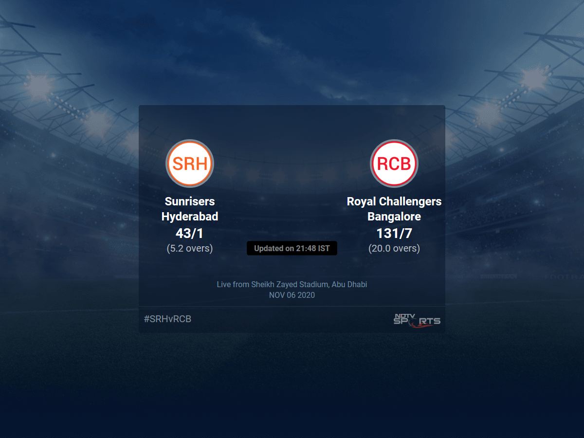 A dedicated team of experts bring you live score, live cricket score, live match update on Sports.NDTV.com. After 5.2 overs, Sunrisers Hyderabad, chasing a target of 132, are 43/1. The live updates of Sunrisers Hyderabad vs Royal Challengers Bangalore scorecard is also available. It is the perfect platform to follow your favourite teams in Indian Premier League 2020. Keep a track on your favourite batsmen and bowlers through Indian Premier League 2020 today match, ball by ball commentary, Sunrisers Hyderabad vs Royal Challengers Bangalore, Sunrisers Hyderabad vs Royal Challengers Bangalore live score, Sunrisers Hyderabad vs Royal Challengers Bangalore scorecard. Follow the excitement of the Indian Premier League 2020 on Sports.NDTV.com as you can follow live match updates and live cricket score through our platform.