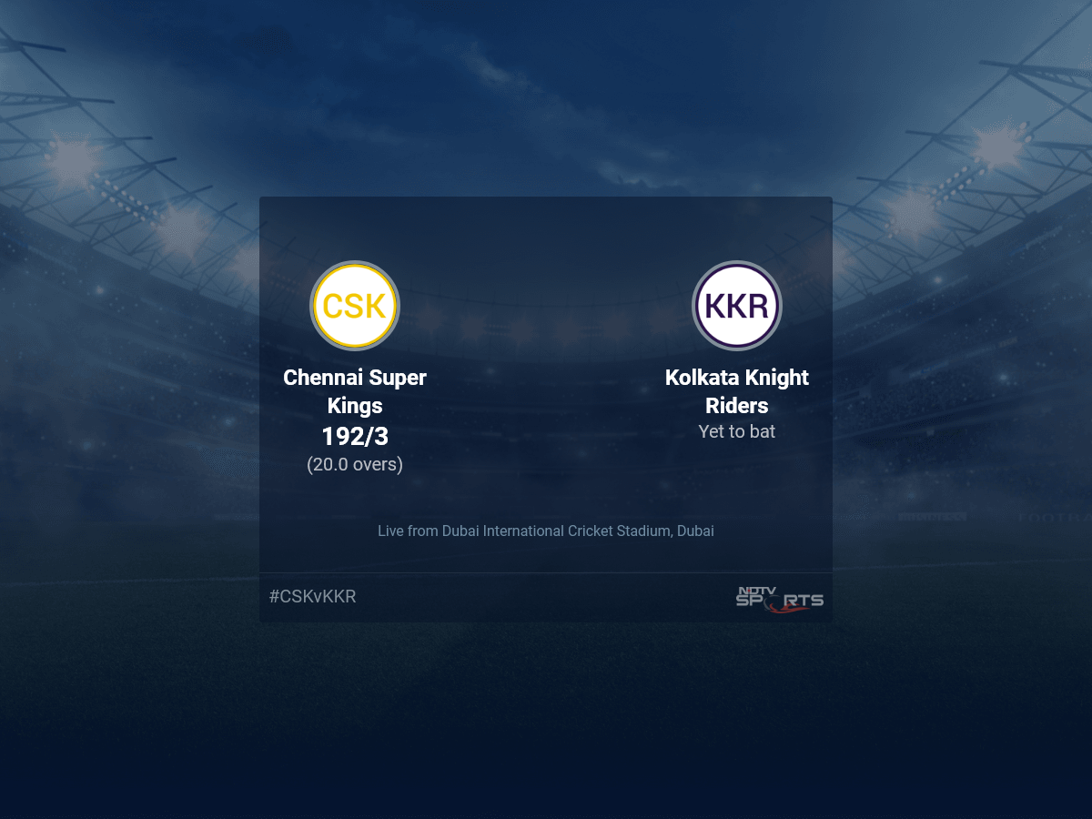 Follow the Indian Premier League 2021 live cricket score on Sports.NDTV.com. After 20.0 overs, Chennai Super Kings are 192/3. Get live score, ball by ball commentary and much more. Keep track of Indian Premier League 2021 today match between Chennai Super Kings and Kolkata Knight Riders. Everything related to Chennai Super Kings and Kolkata Knight Riders match will be available on Sports.NDTV.com. Stay updated with Chennai Super Kings vs Kolkata Knight Riders live score. Do check for Chennai Super Kings vs Kolkata Knight Riders scorecard. You can get scorecard updates, match related facts. Get quick live updates with ads, Sports.NDTV.com, which is the perfect destination for live cricket score.
