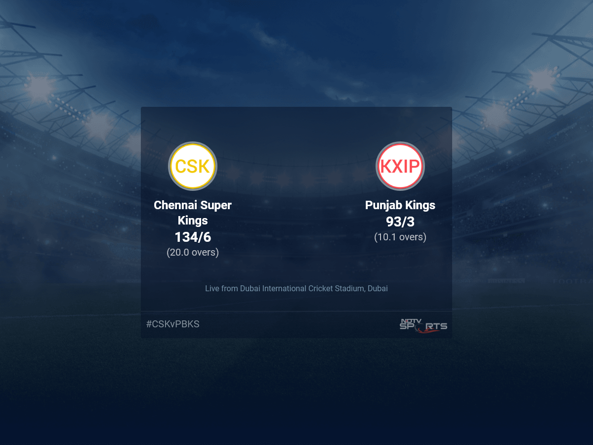 A dedicated team of experts bring you live score, live cricket score, live match update on Sports.NDTV.com. After 10.1 overs, Punjab Kings, chasing a target of 135, are 93/3. The live updates of Chennai Super Kings vs Punjab Kings scorecard is also available. It is the perfect platform to follow your favourite teams in Indian Premier League 2021. Keep a track on your favourite batsmen and bowlers through Indian Premier League 2021 today match, ball by ball commentary, Chennai Super Kings vs Punjab Kings, Chennai Super Kings vs Punjab Kings live score, Chennai Super Kings vs Punjab Kings scorecard. Follow the excitement of the Indian Premier League 2021 on Sports.NDTV.com as you can follow live match updates and live cricket score through our platform.