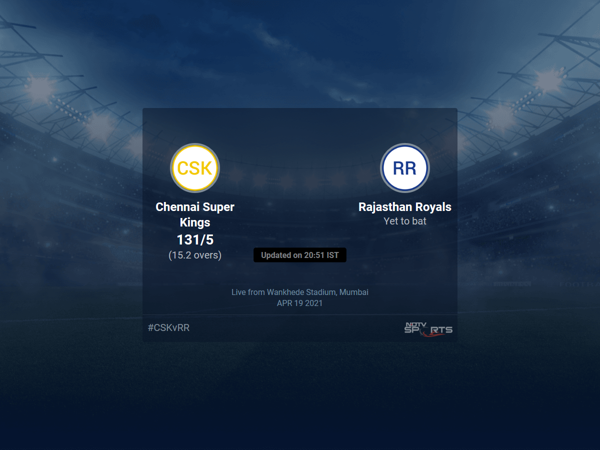 Follow the Indian Premier League 2021 live cricket score on Sports.NDTV.com. After 15.2 overs, Chennai Super Kings are 131/5. Get live score, ball by ball commentary and much more. Keep track of Indian Premier League 2021 today match between Chennai Super Kings and Rajasthan Royals. Everything related to Chennai Super Kings and Rajasthan Royals match will be available on Sports.NDTV.com. Stay updated with Chennai Super Kings vs Rajasthan Royals live score. Do check for Chennai Super Kings vs Rajasthan Royals scorecard. You can get scorecard updates, match related facts. Get quick live updates with ads, Sports.NDTV.com, which is the perfect destination for live cricket score.