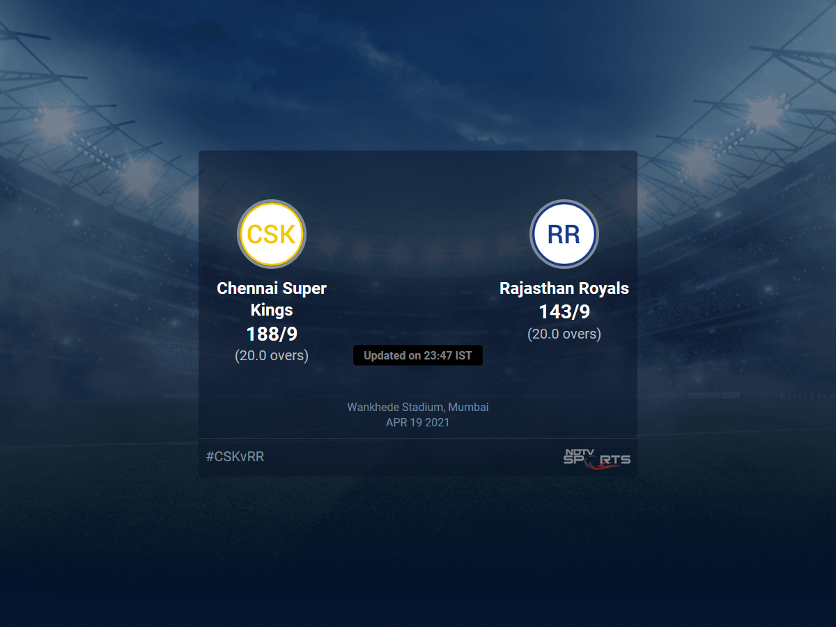 Follow the Indian Premier League 2021 live cricket score on Sports.NDTV.com. After 20.0 overs, Rajasthan Royals, chasing a target of 189, are 143/9. Get live score, ball by ball commentary and much more. Keep track of Indian Premier League 2021 today match between Chennai Super Kings and Rajasthan Royals. Everything related to Chennai Super Kings and Rajasthan Royals match will be available on Sports.NDTV.com. Stay updated with Chennai Super Kings vs Rajasthan Royals live score. Do check for Chennai Super Kings vs Rajasthan Royals scorecard. You can get scorecard updates, match related facts. Get quick live updates with ads, Sports.NDTV.com, which is the perfect destination for live cricket score.