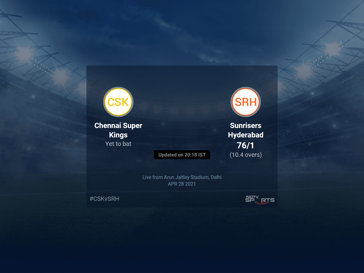 A dedicated team of experts bring you live score, live cricket score, live match update on Sports.NDTV.com. After 10.4 overs, Sunrisers Hyderabad are 76/1. The live updates of Chennai Super Kings vs Sunrisers Hyderabad scorecard is also available. It is the perfect platform to follow your favourite teams in Indian Premier League 2021. Keep a track on your favourite batsmen and bowlers through Indian Premier League 2021 today match, ball by ball commentary, Chennai Super Kings vs Sunrisers Hyderabad, Chennai Super Kings vs Sunrisers Hyderabad live score, Chennai Super Kings vs Sunrisers Hyderabad scorecard. Follow the excitement of the Indian Premier League 2021 on Sports.NDTV.com as you can follow live match updates and live cricket score through our platform.
