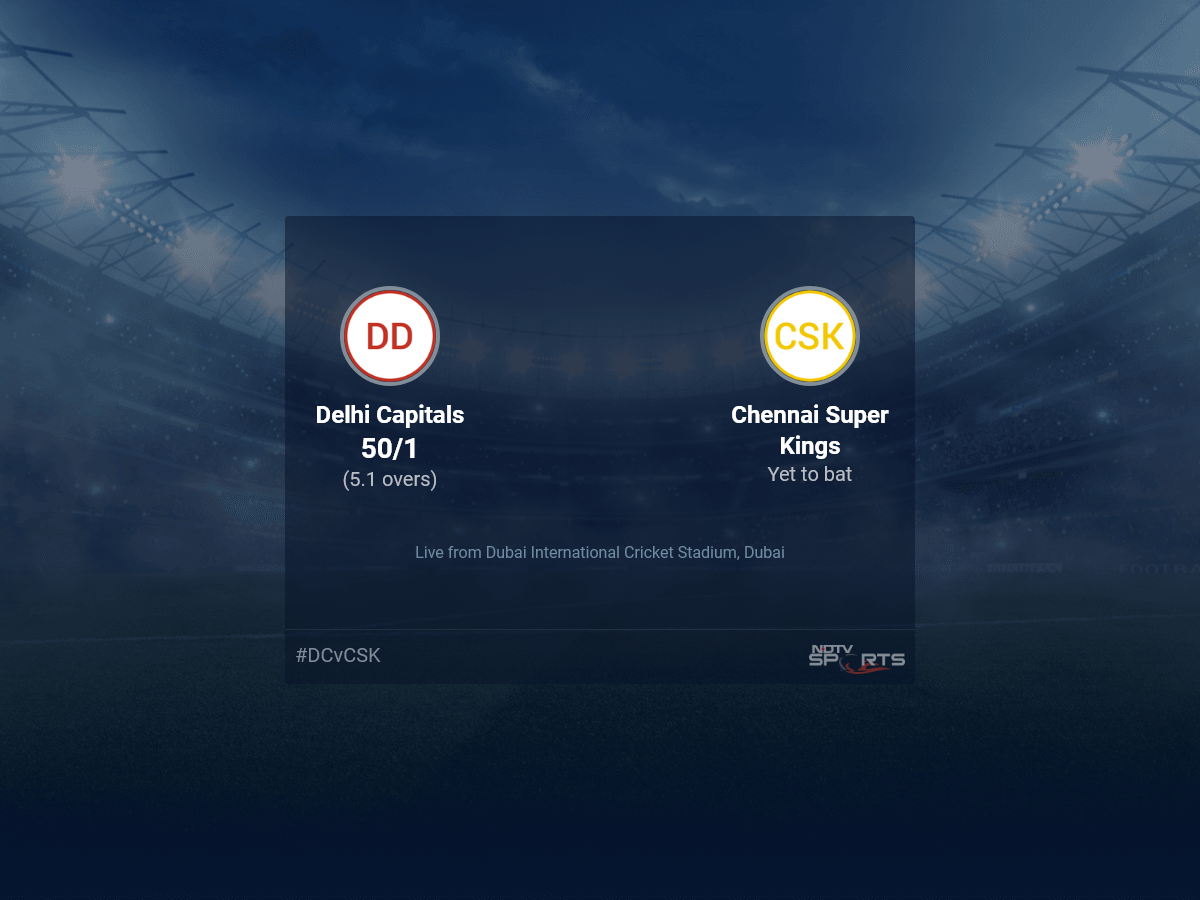 A dedicated team of experts bring you live score, live cricket score, live match update on Sports.NDTV.com. After 5.1 overs, Delhi Capitals are 50/1. The live updates of Delhi Capitals vs Chennai Super Kings scorecard is also available. It is the perfect platform to follow your favourite teams in Indian Premier League 2021. Keep a track on your favourite batsmen and bowlers through Indian Premier League 2021 today match, ball by ball commentary, Delhi Capitals vs Chennai Super Kings, Delhi Capitals vs Chennai Super Kings live score, Delhi Capitals vs Chennai Super Kings scorecard. Follow the excitement of the Indian Premier League 2021 on Sports.NDTV.com as you can follow live match updates and live cricket score through our platform.
