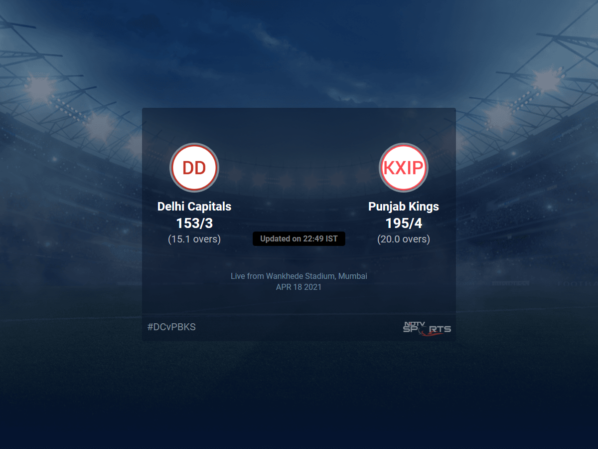 Follow the Indian Premier League 2021 live cricket score on Sports.NDTV.com. After 15.1 overs, Delhi Capitals, chasing a target of 196, are 153/3. Get live score, ball by ball commentary and much more. Keep track of Indian Premier League 2021 today match between Delhi Capitals and Punjab Kings. Everything related to Delhi Capitals and Punjab Kings match will be available on Sports.NDTV.com. Stay updated with Delhi Capitals vs Punjab Kings live score. Do check for Delhi Capitals vs Punjab Kings scorecard. You can get scorecard updates, match related facts. Get quick live updates with ads, Sports.NDTV.com, which is the perfect destination for live cricket score.