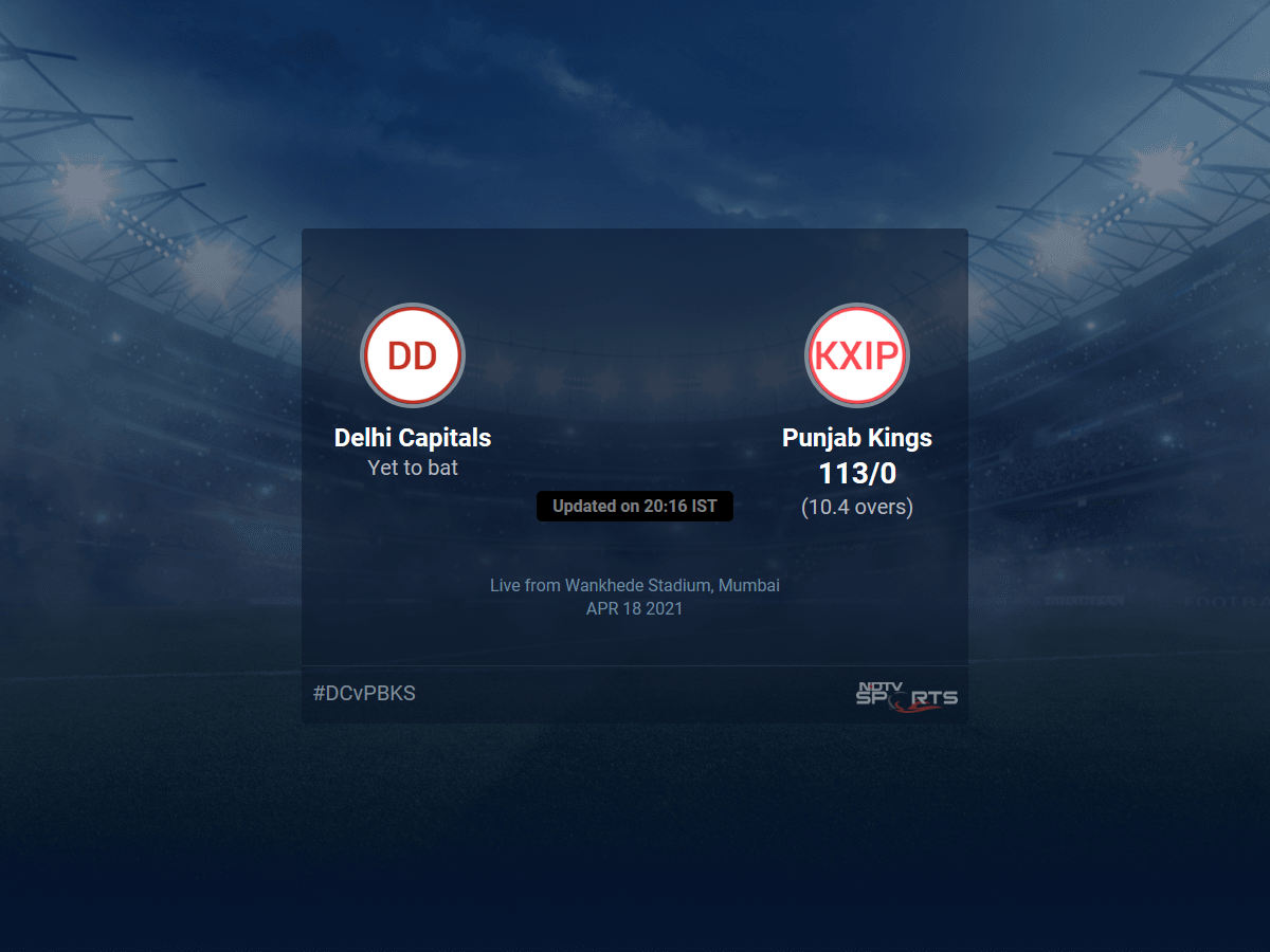 Follow the Indian Premier League 2021 live cricket score on Sports.NDTV.com. After 10.4 overs, Punjab Kings are 113/0. Get live score, ball by ball commentary and much more. Keep track of Indian Premier League 2021 today match between Delhi Capitals and Punjab Kings. Everything related to Delhi Capitals and Punjab Kings match will be available on Sports.NDTV.com. Stay updated with Delhi Capitals vs Punjab Kings live score. Do check for Delhi Capitals vs Punjab Kings scorecard. You can get scorecard updates, match related facts. Get quick live updates with ads, Sports.NDTV.com, which is the perfect destination for live cricket score.