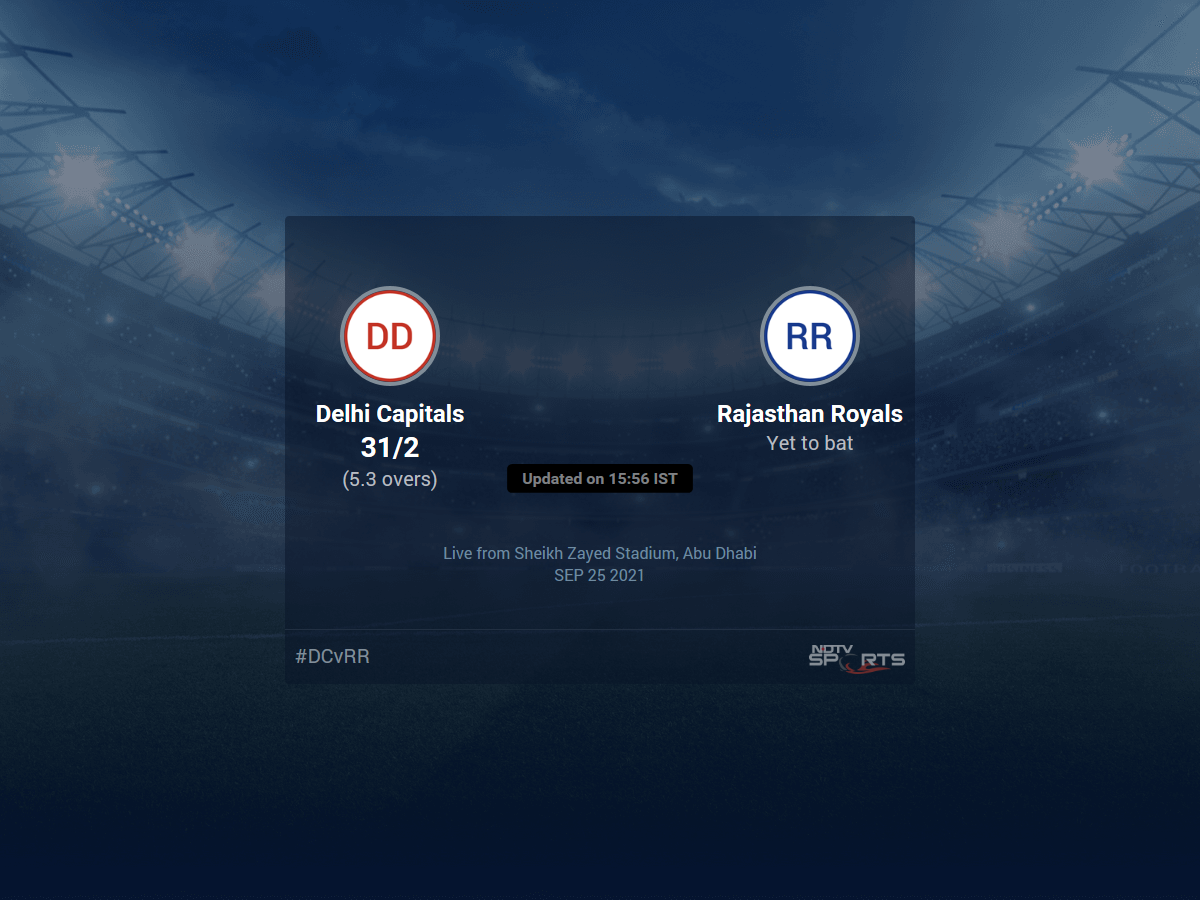 A dedicated team of experts bring you live score, live cricket score, live match update on Sports.NDTV.com. After 5.3 overs, Delhi Capitals are 31/2. The live updates of Delhi Capitals vs Rajasthan Royals scorecard is also available. It is the perfect platform to follow your favourite teams in Indian Premier League 2021. Keep a track on your favourite batsmen and bowlers through Indian Premier League 2021 today match, ball by ball commentary, Delhi Capitals vs Rajasthan Royals, Delhi Capitals vs Rajasthan Royals live score, Delhi Capitals vs Rajasthan Royals scorecard. Follow the excitement of the Indian Premier League 2021 on Sports.NDTV.com as you can follow live match updates and live cricket score through our platform.