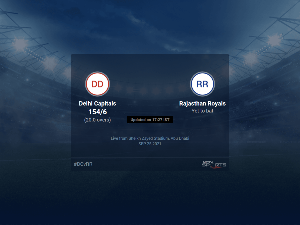 Follow the Indian Premier League 2021 live cricket score on Sports.NDTV.com. After 20.0 overs, Delhi Capitals are 154/6. Get live score, ball by ball commentary and much more. Keep track of Indian Premier League 2021 today match between Delhi Capitals and Rajasthan Royals. Everything related to Delhi Capitals and Rajasthan Royals match will be available on Sports.NDTV.com. Stay updated with Delhi Capitals vs Rajasthan Royals live score. Do check for Delhi Capitals vs Rajasthan Royals scorecard. You can get scorecard updates, match related facts. Get quick live updates with ads, Sports.NDTV.com, which is the perfect destination for live cricket score.