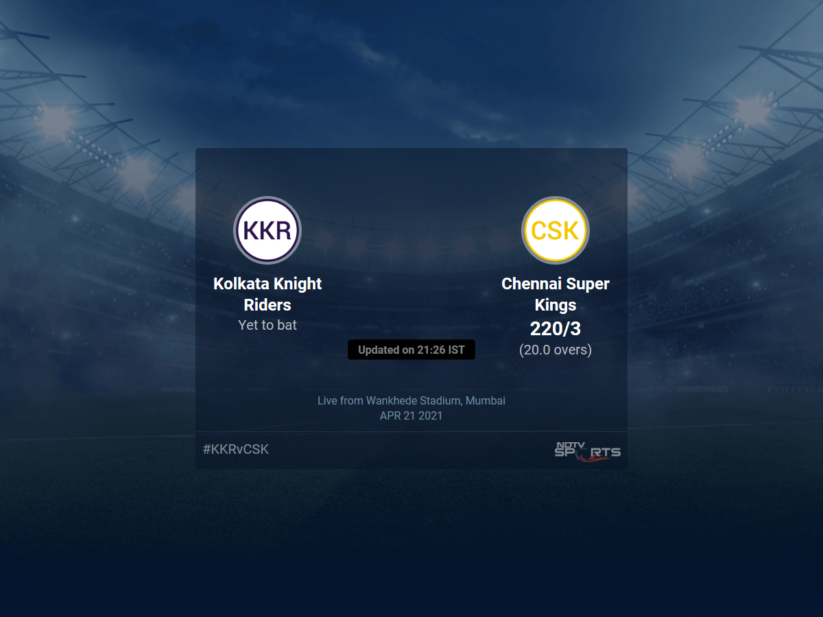 A dedicated team of experts bring you live score, live cricket score, live match update on Sports.NDTV.com. After 20.0 overs, Chennai Super Kings are 220/3. The live updates of Kolkata Knight Riders vs Chennai Super Kings scorecard is also available. It is the perfect platform to follow your favourite teams in Indian Premier League 2021. Keep a track on your favourite batsmen and bowlers through Indian Premier League 2021 today match, ball by ball commentary, Kolkata Knight Riders vs Chennai Super Kings, Kolkata Knight Riders vs Chennai Super Kings live score, Kolkata Knight Riders vs Chennai Super Kings scorecard. Follow the excitement of the Indian Premier League 2021 on Sports.NDTV.com as you can follow live match updates and live cricket score through our platform.