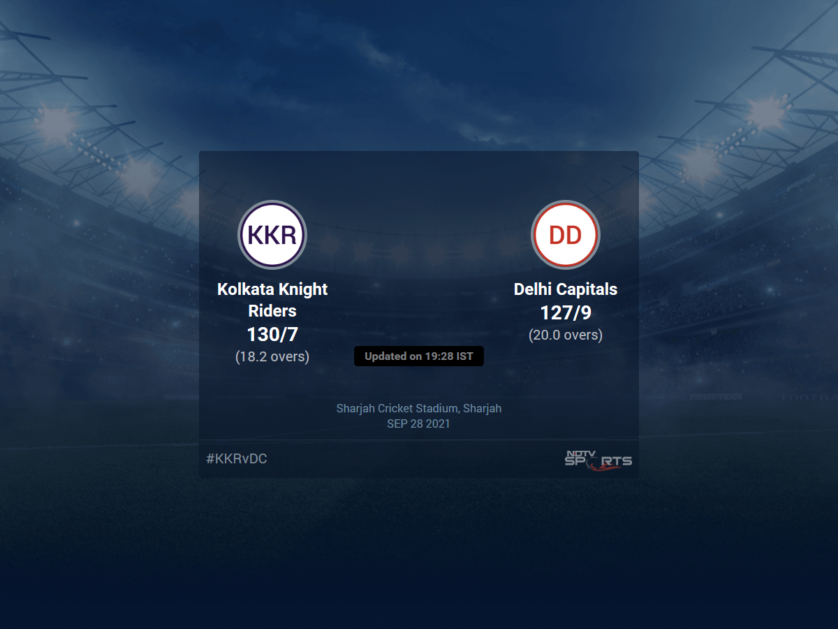 A dedicated team of experts bring you live score, live cricket score, live match update on Sports.NDTV.com. After 18.2 overs, Kolkata Knight Riders, chasing a target of 128, are 130/7. The live updates of Kolkata Knight Riders vs Delhi Capitals scorecard is also available. It is the perfect platform to follow your favourite teams in Indian Premier League 2021. Keep a track on your favourite batsmen and bowlers through Indian Premier League 2021 today match, ball by ball commentary, Kolkata Knight Riders vs Delhi Capitals, Kolkata Knight Riders vs Delhi Capitals live score, Kolkata Knight Riders vs Delhi Capitals scorecard. Follow the excitement of the Indian Premier League 2021 on Sports.NDTV.com as you can follow live match updates and live cricket score through our platform.