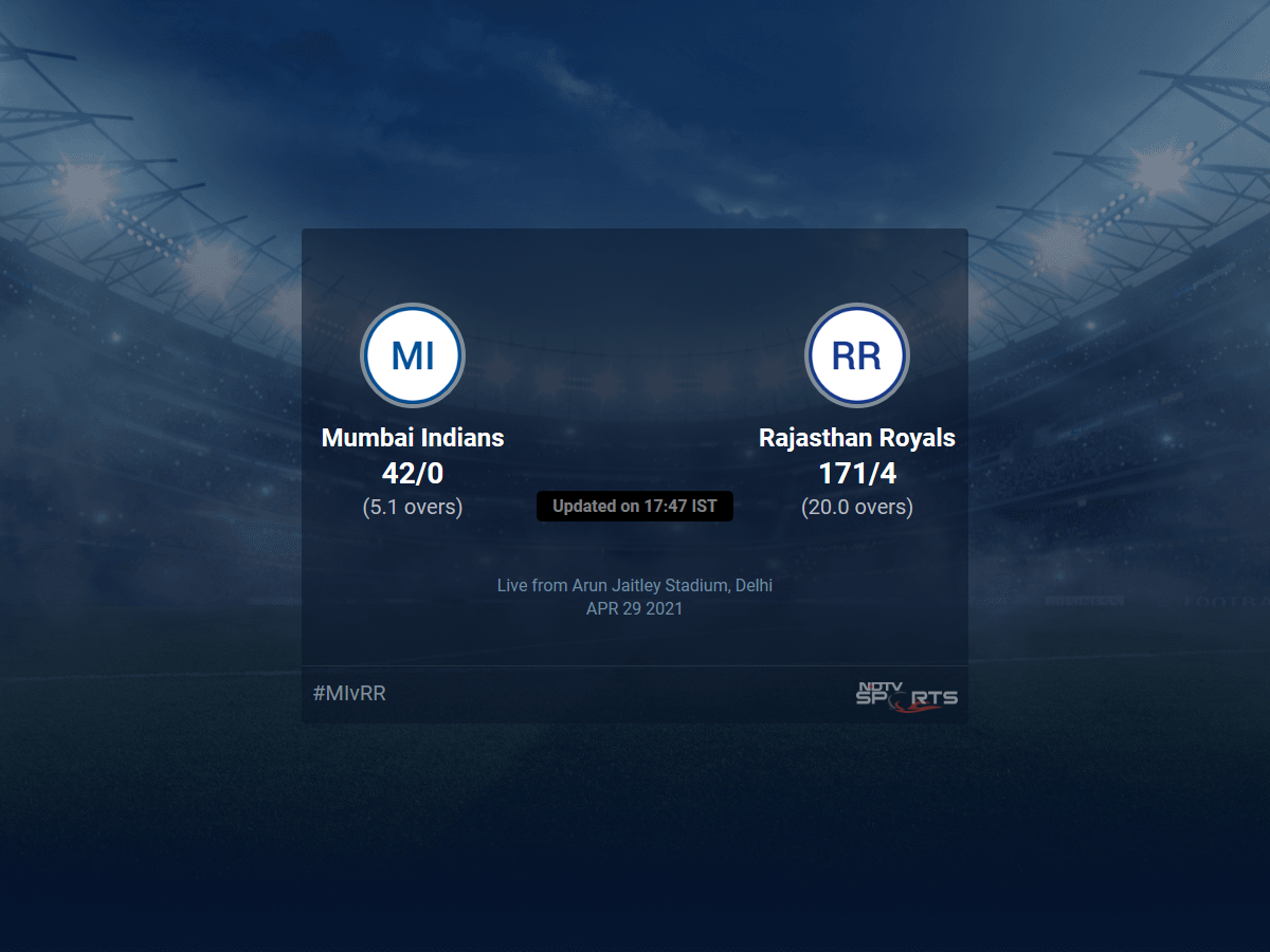 Follow the Indian Premier League 2021 live cricket score on Sports.NDTV.com. After 5.1 overs, Mumbai Indians, chasing a target of 172, are 42/0. Get live score, ball by ball commentary and much more. Keep track of Indian Premier League 2021 today match between Mumbai Indians and Rajasthan Royals. Everything related to Mumbai Indians and Rajasthan Royals match will be available on Sports.NDTV.com. Stay updated with Mumbai Indians vs Rajasthan Royals live score. Do check for Mumbai Indians vs Rajasthan Royals scorecard. You can get scorecard updates, match related facts. Get quick live updates with ads, Sports.NDTV.com, which is the perfect destination for live cricket score.