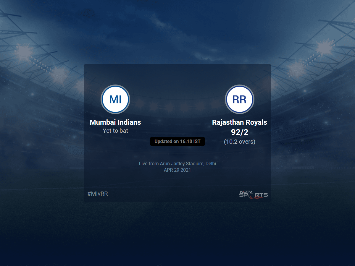 Follow the Indian Premier League 2021 live cricket score on Sports.NDTV.com. After 10.2 overs, Rajasthan Royals are 92/2. Get live score, ball by ball commentary and much more. Keep track of Indian Premier League 2021 today match between Mumbai Indians and Rajasthan Royals. Everything related to Mumbai Indians and Rajasthan Royals match will be available on Sports.NDTV.com. Stay updated with Mumbai Indians vs Rajasthan Royals live score. Do check for Mumbai Indians vs Rajasthan Royals scorecard. You can get scorecard updates, match related facts. Get quick live updates with ads, Sports.NDTV.com, which is the perfect destination for live cricket score.