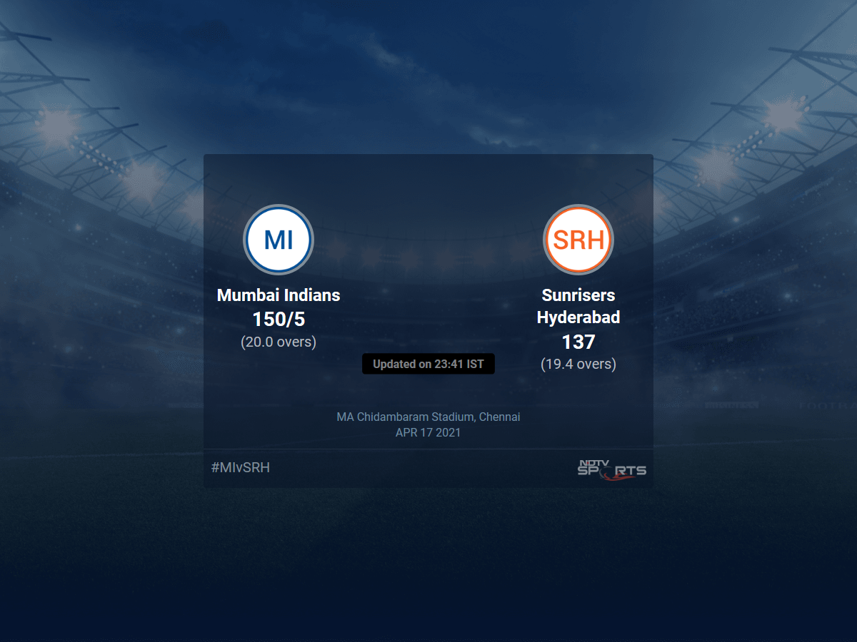 A dedicated team of experts bring you live score, live cricket score, live match update on Sports.NDTV.com. After 19.4 overs, Sunrisers Hyderabad, chasing a target of 151, are 137. The live updates of Mumbai Indians vs Sunrisers Hyderabad scorecard is also available. It is the perfect platform to follow your favourite teams in Indian Premier League 2021. Keep a track on your favourite batsmen and bowlers through Indian Premier League 2021 today match, ball by ball commentary, Mumbai Indians vs Sunrisers Hyderabad, Mumbai Indians vs Sunrisers Hyderabad live score, Mumbai Indians vs Sunrisers Hyderabad scorecard. Follow the excitement of the Indian Premier League 2021 on Sports.NDTV.com as you can follow live match updates and live cricket score through our platform.