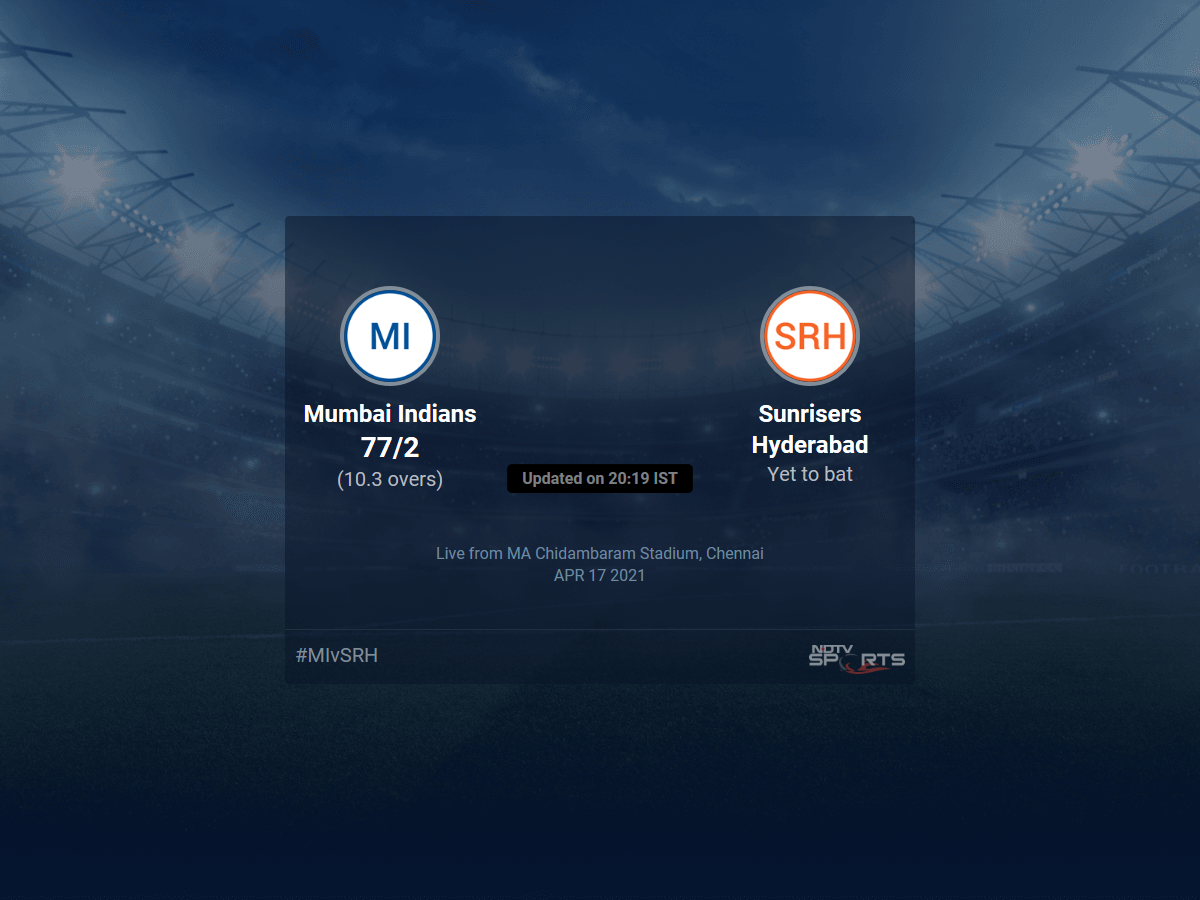 A dedicated team of experts bring you live score, live cricket score, live match update on Sports.NDTV.com. After 10.3 overs, Mumbai Indians are 77/2. The live updates of Mumbai Indians vs Sunrisers Hyderabad scorecard is also available. It is the perfect platform to follow your favourite teams in Indian Premier League 2021. Keep a track on your favourite batsmen and bowlers through Indian Premier League 2021 today match, ball by ball commentary, Mumbai Indians vs Sunrisers Hyderabad, Mumbai Indians vs Sunrisers Hyderabad live score, Mumbai Indians vs Sunrisers Hyderabad scorecard. Follow the excitement of the Indian Premier League 2021 on Sports.NDTV.com as you can follow live match updates and live cricket score through our platform.
