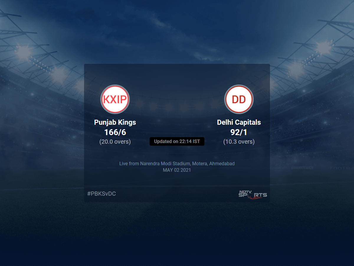 A dedicated team of experts bring you live score, live cricket score, live match update on Sports.NDTV.com. After 10.3 overs, Delhi Capitals, chasing a target of 167, are 92/1. The live updates of Punjab Kings vs Delhi Capitals scorecard is also available. It is the perfect platform to follow your favourite teams in Indian Premier League 2021. Keep a track on your favourite batsmen and bowlers through Indian Premier League 2021 today match, ball by ball commentary, Punjab Kings vs Delhi Capitals, Punjab Kings vs Delhi Capitals live score, Punjab Kings vs Delhi Capitals scorecard. Follow the excitement of the Indian Premier League 2021 on Sports.NDTV.com as you can follow live match updates and live cricket score through our platform.