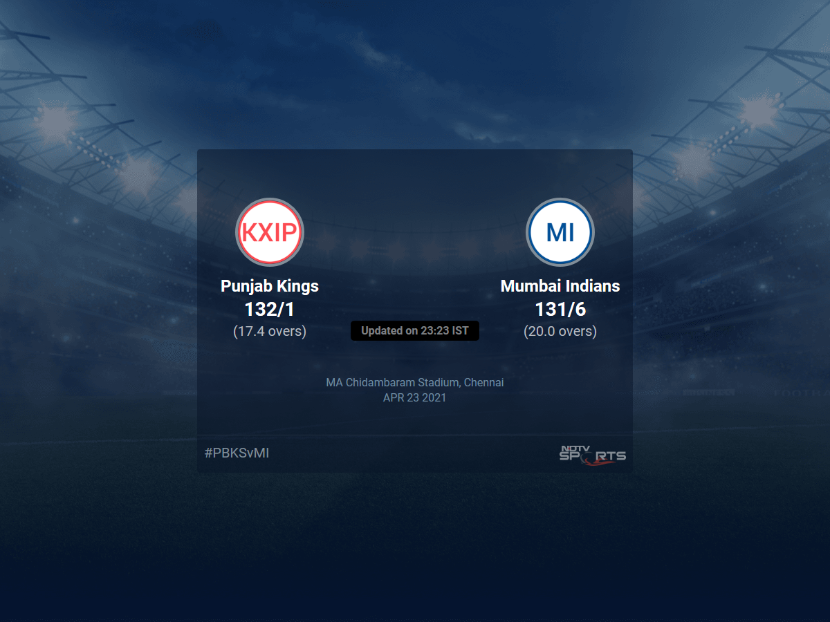 Follow the Indian Premier League 2021 live cricket score on Sports.NDTV.com. After 17.4 overs, Punjab Kings, chasing a target of 132, are 132/1. Get live score, ball by ball commentary and much more. Keep track of Indian Premier League 2021 today match between Punjab Kings and Mumbai Indians. Everything related to Punjab Kings and Mumbai Indians match will be available on Sports.NDTV.com. Stay updated with Punjab Kings vs Mumbai Indians live score. Do check for Punjab Kings vs Mumbai Indians scorecard. You can get scorecard updates, match related facts. Get quick live updates with ads, Sports.NDTV.com, which is the perfect destination for live cricket score.