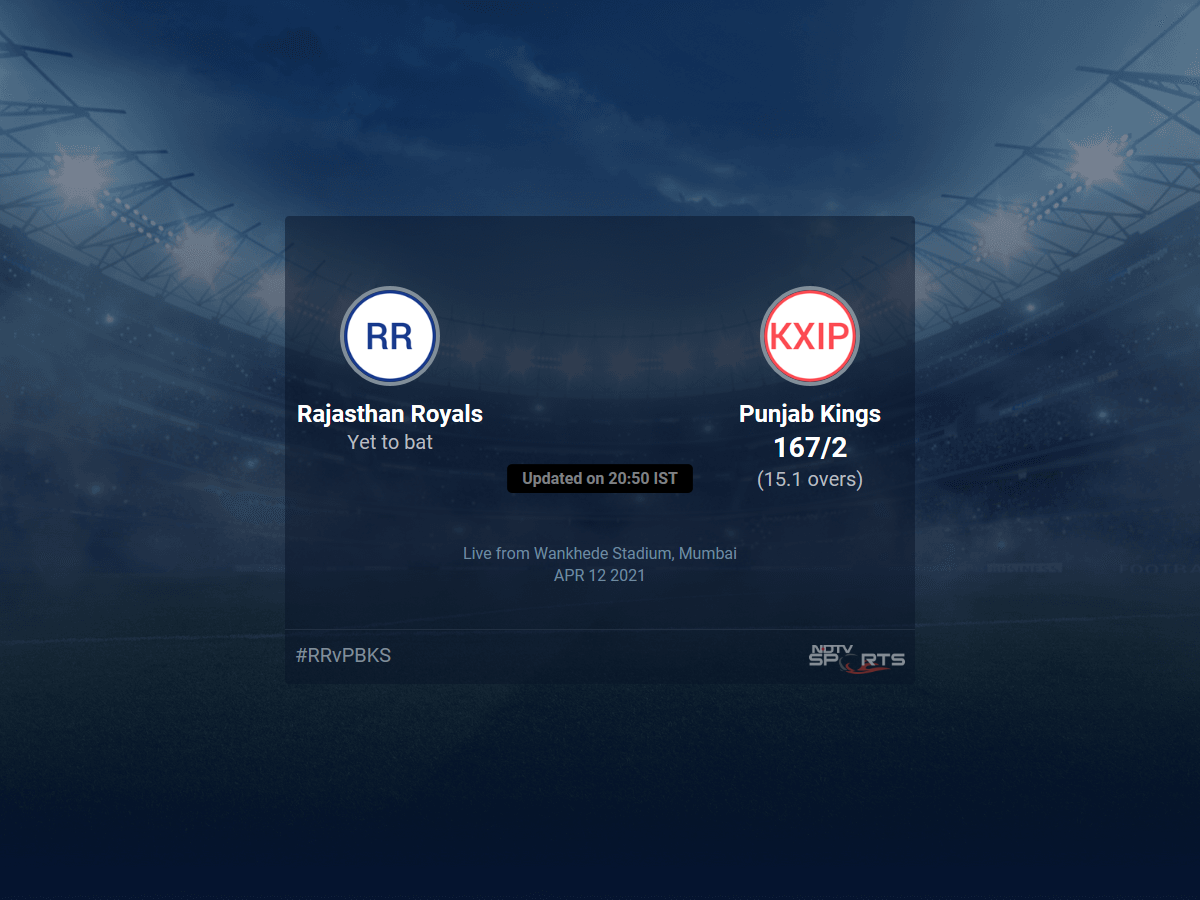 Follow the Indian Premier League 2021 live cricket score on Sports.NDTV.com. After 15.1 overs, Punjab Kings are 167/2. Get live score, ball by ball commentary and much more. Keep track of Indian Premier League 2021 today match between Rajasthan Royals and Punjab Kings. Everything related to Rajasthan Royals and Punjab Kings match will be available on Sports.NDTV.com. Stay updated with Rajasthan Royals vs Punjab Kings live score. Do check for Rajasthan Royals vs Punjab Kings scorecard. You can get scorecard updates, match related facts. Get quick live updates with ads, Sports.NDTV.com, which is the perfect destination for live cricket score.