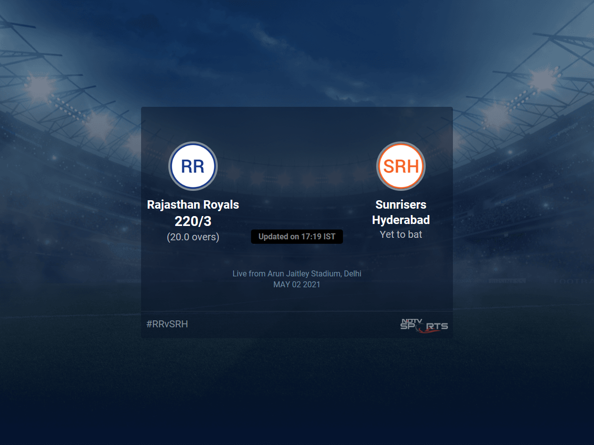 Follow the Indian Premier League 2021 live cricket score on Sports.NDTV.com. After 20.0 overs, Rajasthan Royals are 220/3. Get live score, ball by ball commentary and much more. Keep track of Indian Premier League 2021 today match between Rajasthan Royals and Sunrisers Hyderabad. Everything related to Rajasthan Royals and Sunrisers Hyderabad match will be available on Sports.NDTV.com. Stay updated with Rajasthan Royals vs Sunrisers Hyderabad live score. Do check for Rajasthan Royals vs Sunrisers Hyderabad scorecard. You can get scorecard updates, match related facts. Get quick live updates with ads, Sports.NDTV.com, which is the perfect destination for live cricket score.