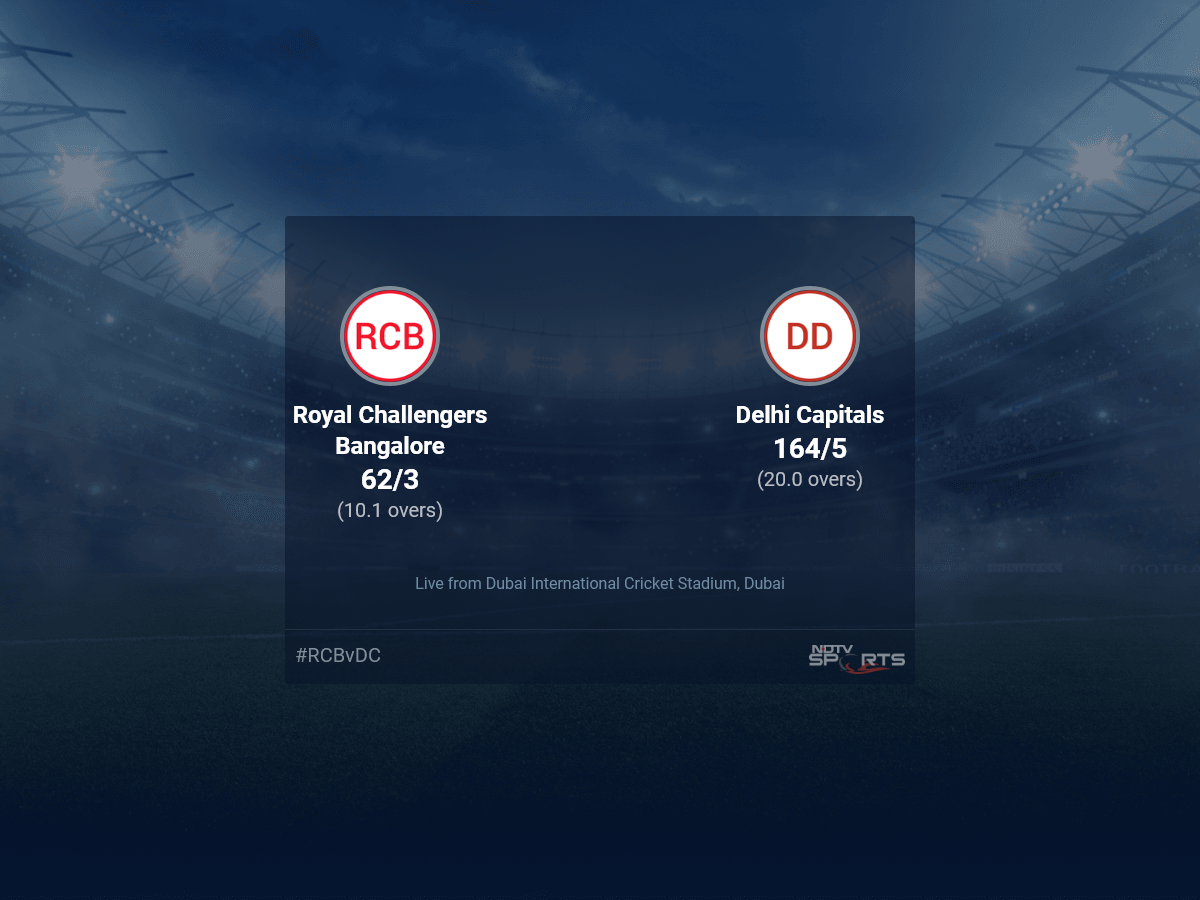 A dedicated team of experts bring you live score, live cricket score, live match update on Sports.NDTV.com. After 10.1 overs, Royal Challengers Bangalore, chasing a target of 165, are 62/3. The live updates of Royal Challengers Bangalore vs Delhi Capitals scorecard is also available. It is the perfect platform to follow your favourite teams in Indian Premier League 2021. Keep a track on your favourite batsmen and bowlers through Indian Premier League 2021 today match, ball by ball commentary, Royal Challengers Bangalore vs Delhi Capitals, Royal Challengers Bangalore vs Delhi Capitals live score, Royal Challengers Bangalore vs Delhi Capitals scorecard. Follow the excitement of the Indian Premier League 2021 on Sports.NDTV.com as you can follow live match updates and live cricket score through our platform.
