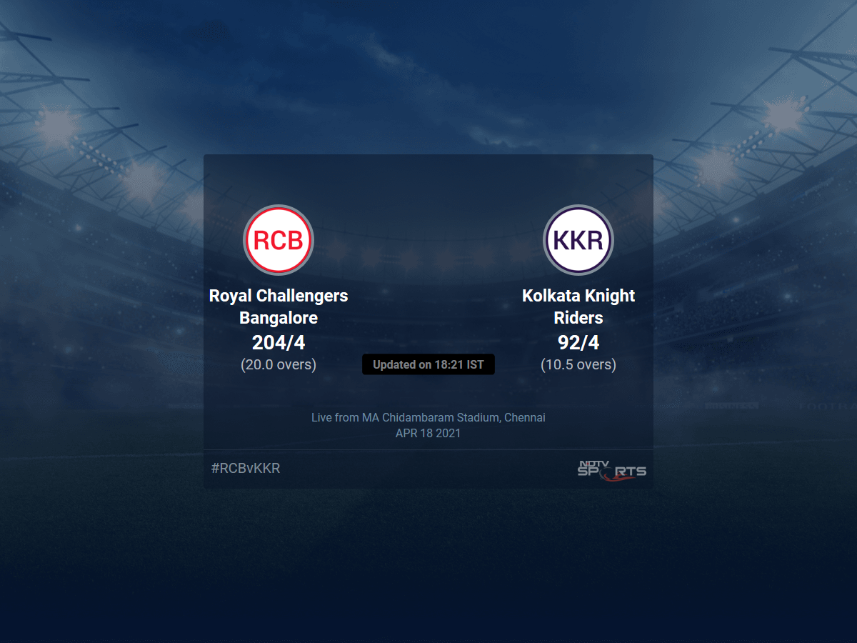 Follow the Indian Premier League 2021 live cricket score on Sports.NDTV.com. After 10.5 overs, Kolkata Knight Riders, chasing a target of 205, are 92/4. Get live score, ball by ball commentary and much more. Keep track of Indian Premier League 2021 today match between Royal Challengers Bangalore and Kolkata Knight Riders. Everything related to Royal Challengers Bangalore and Kolkata Knight Riders match will be available on Sports.NDTV.com. Stay updated with Royal Challengers Bangalore vs Kolkata Knight Riders live score. Do check for Royal Challengers Bangalore vs Kolkata Knight Riders scorecard. You can get scorecard updates, match related facts. Get quick live updates with ads, Sports.NDTV.com, which is the perfect destination for live cricket score.