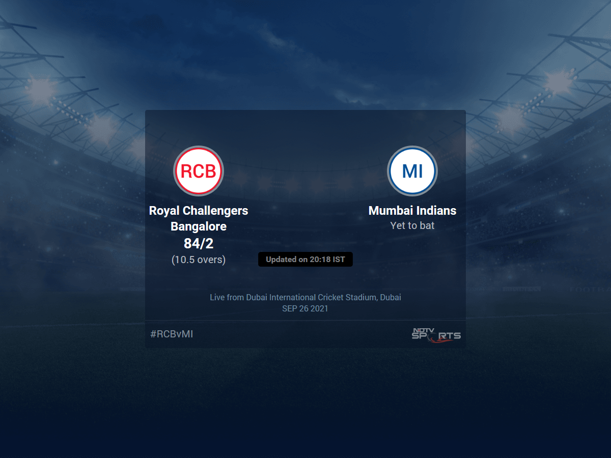 Follow the Indian Premier League 2021 live cricket score on Sports.NDTV.com. After 10.5 overs, Royal Challengers Bangalore are 84/2. Get live score, ball by ball commentary and much more. Keep track of Indian Premier League 2021 today match between Royal Challengers Bangalore and Mumbai Indians. Everything related to Royal Challengers Bangalore and Mumbai Indians match will be available on Sports.NDTV.com. Stay updated with Royal Challengers Bangalore vs Mumbai Indians live score. Do check for Royal Challengers Bangalore vs Mumbai Indians scorecard. You can get scorecard updates, match related facts. Get quick live updates with ads, Sports.NDTV.com, which is the perfect destination for live cricket score.