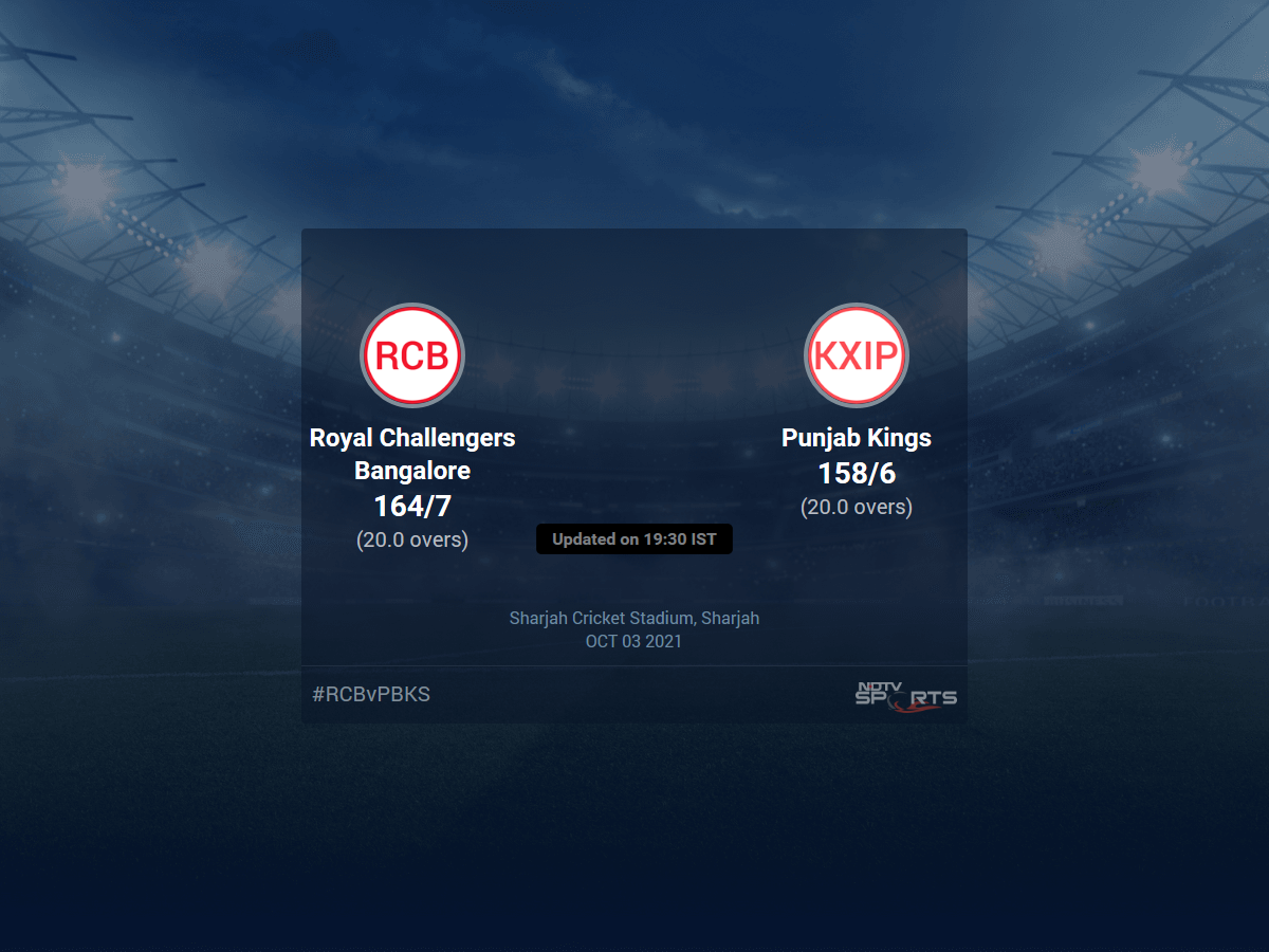 Follow the Indian Premier League 2021 live cricket score on Sports.NDTV.com. After 20.0 overs, Punjab Kings, chasing a target of 165, are 158/6. Get live score, ball by ball commentary and much more. Keep track of Indian Premier League 2021 today match between Royal Challengers Bangalore and Punjab Kings. Everything related to Royal Challengers Bangalore and Punjab Kings match will be available on Sports.NDTV.com. Stay updated with Royal Challengers Bangalore vs Punjab Kings live score. Do check for Royal Challengers Bangalore vs Punjab Kings scorecard. You can get scorecard updates, match related facts. Get quick live updates with ads, Sports.NDTV.com, which is the perfect destination for live cricket score.