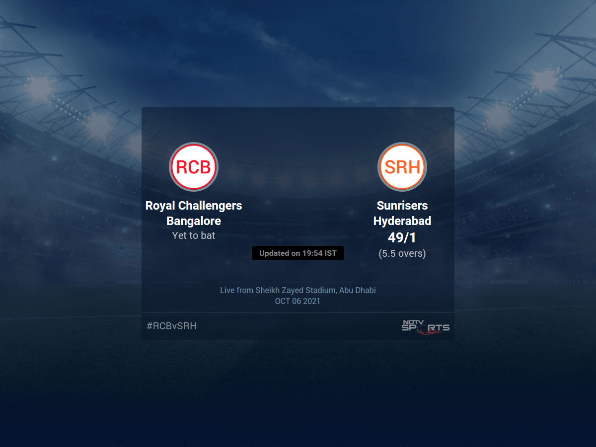 Follow the Indian Premier League 2021 live cricket score on Sports.NDTV.com. After 5.5 overs, Sunrisers Hyderabad are 49/1. Get live score, ball by ball commentary and much more. Keep track of Indian Premier League 2021 today match between Royal Challengers Bangalore and Sunrisers Hyderabad. Everything related to Royal Challengers Bangalore and Sunrisers Hyderabad match will be available on Sports.NDTV.com. Stay updated with Royal Challengers Bangalore vs Sunrisers Hyderabad live score. Do check for Royal Challengers Bangalore vs Sunrisers Hyderabad scorecard. You can get scorecard updates, match related facts. Get quick live updates with ads, Sports.NDTV.com, which is the perfect destination for live cricket score.